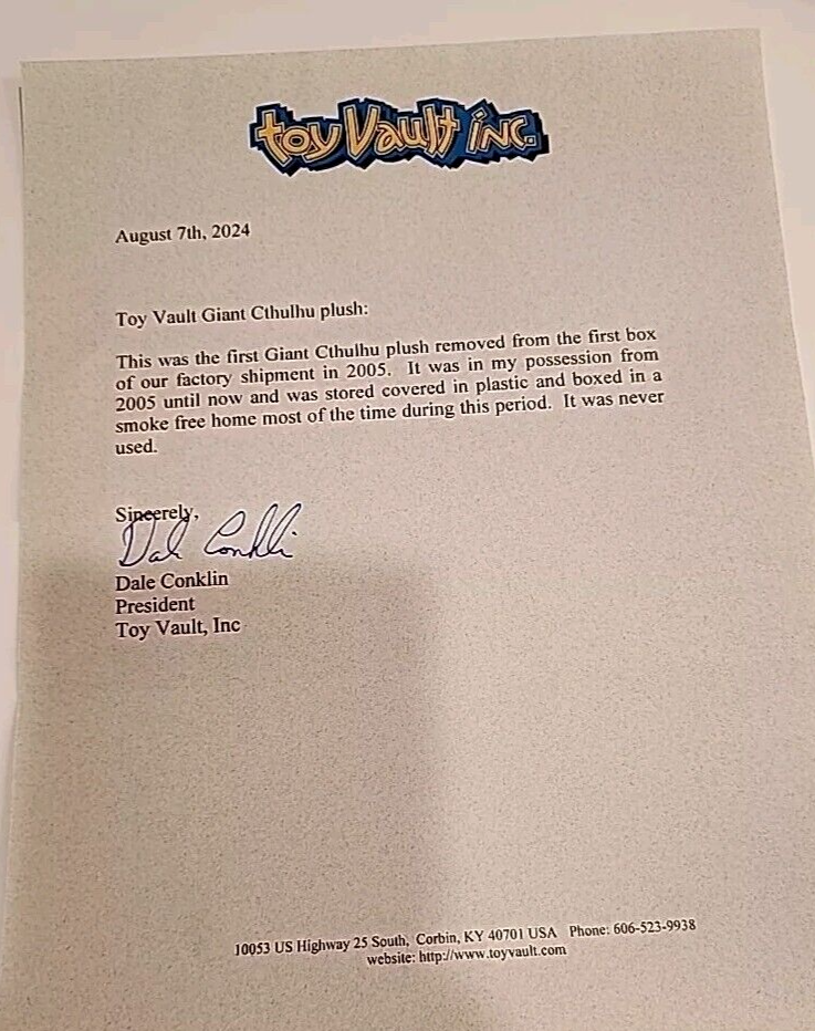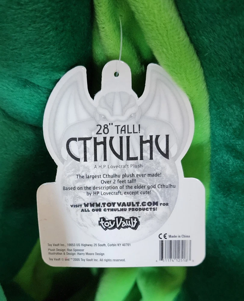 Toy Vault Giant 28" Cthulhu Plush - Rare Limited Edition The listing says "Used" but this was kept in a box most of the time and never used since it was manufactured. This was in the personal collection of the President of Toy Vault from 2005 until now and comes with a certification letter shown in the pictures. This was a very limited edition and there are very few of these available in any condition. This one is in outstanding condition. See all pictures. Shipping is FREE. This will be shipped by FedEx ground with adult signature required. Please provide an address where someone will be available, and able to show their ID when they sign for it. This plush measures about over 28" from top of head to bottom of the feet. It is much, much larger than any of the other Toy Vault Cthulhu plush ever made. You will receive exactly the plush item in all the pictures and no other items. Please make sure this is exactly what you want before purchasing. Feel free to contact me with any questions.