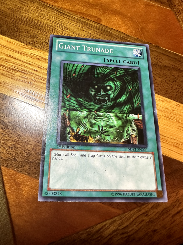 Hello! You are buying one Giant Trunade 5DS3-EN020 1st Edition Common in lightly played condition. Reason for lightly played condition is minor general play/scratchwear, mostly on back. See photos for details! As a thank you for buying from me, I will throw in two free Yugioh commons! Thank you so much for looking, have a great day! If there is ever an issue, please let me know so I can do whatever I can to resolve it! Please check out my other items! I have many more single cards!