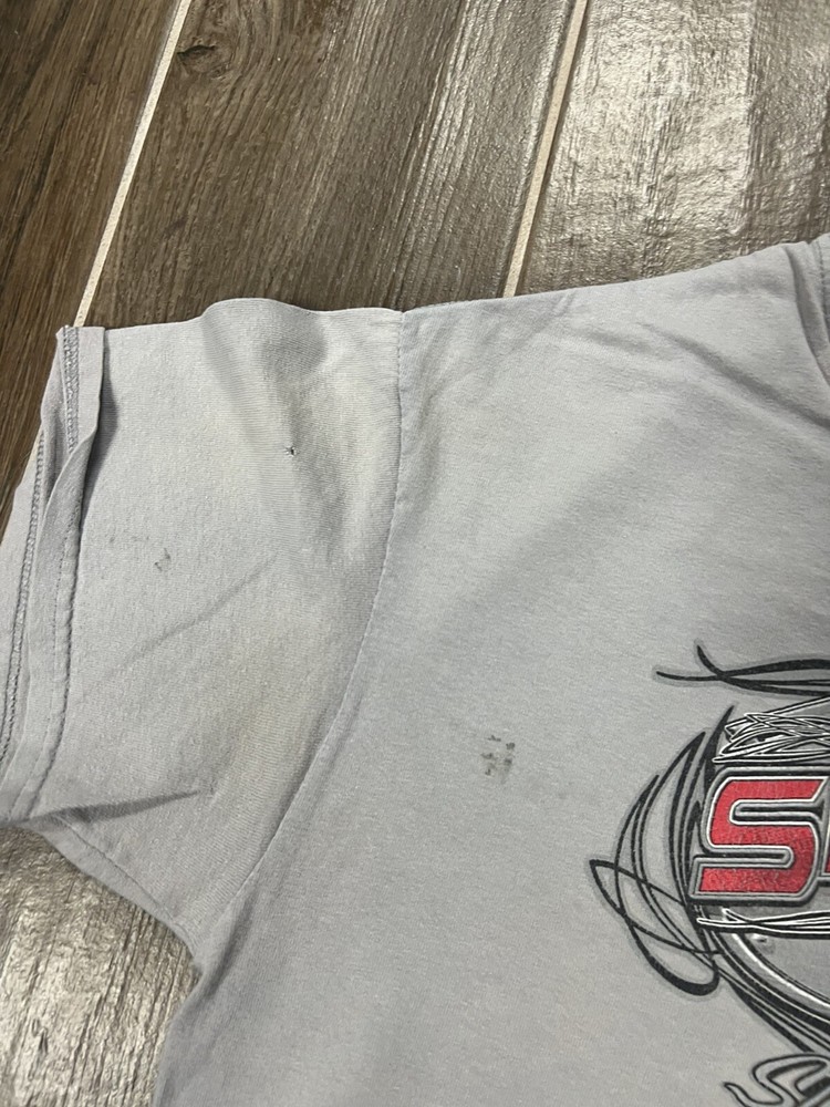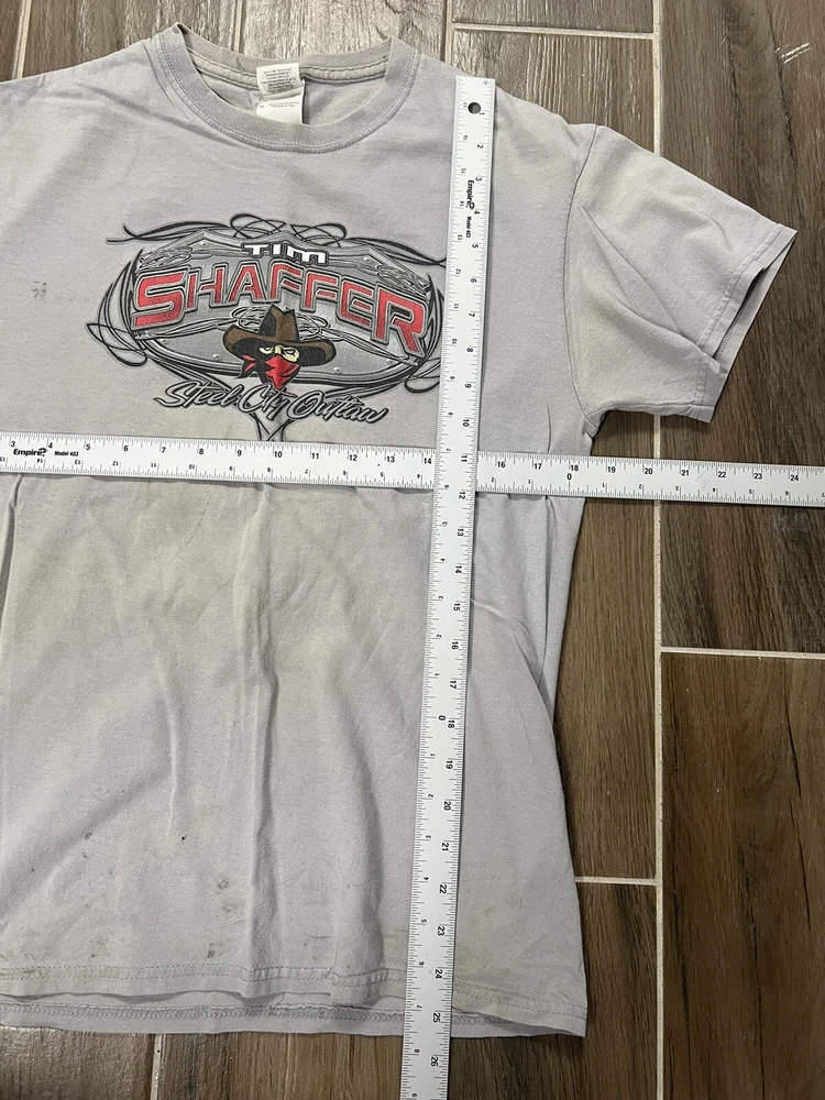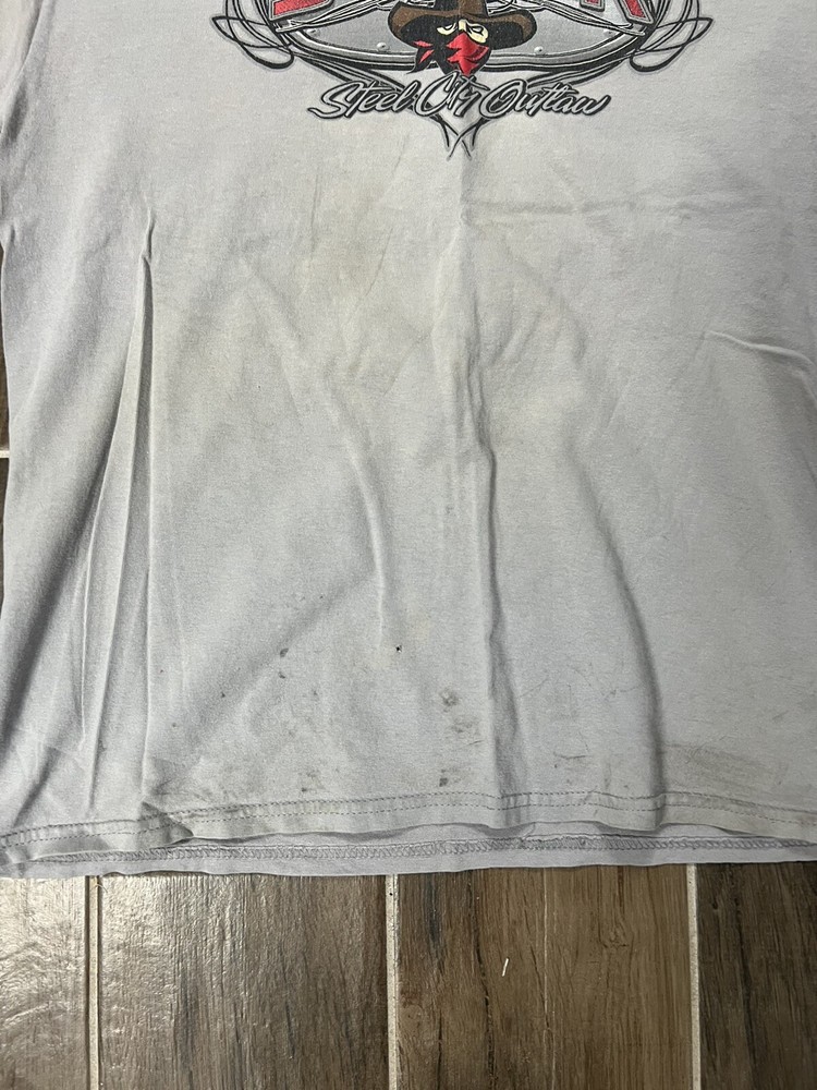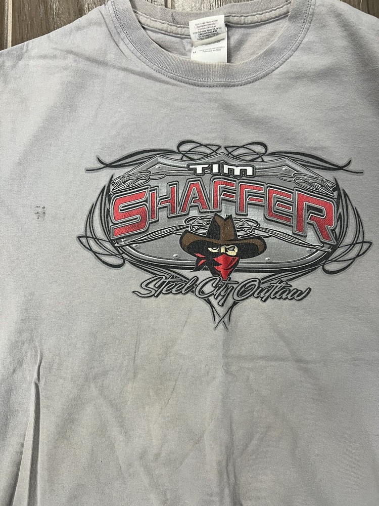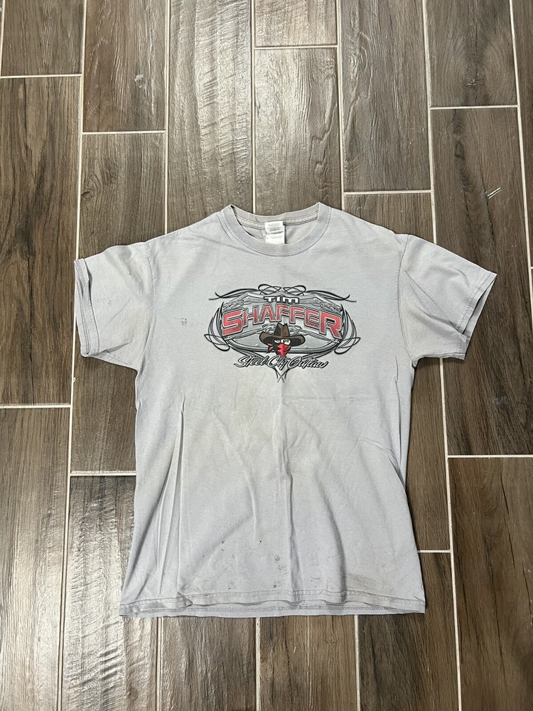 THE ANSWER IS "YES, WE DO COMBINE SHIPPING!" THE MORE YOU BUY THE MORE YOU WILL SAVE. PLEASE CHECK OUT THE REST OF OUR STORE AND ADD TO YOUR ORDER. WE WILL SEND A COMBINED INVOICE ONCE YOU LET US KNOW YOU ARE DONE SHOPPING. If there are any questions, please message us. What you see is what you get! The picture you see is actually what you are bidding on. No bait and switch here. We treat people the way we would like to be treated. We love what we do and know what we are doing. Our feedback is awesome so rest assured you will get what you pay for and fast. We ship out the day of or the next day after we receive payment Gildan Tim Shaffer Steel City Outlaw Gray T-Shirt Size M DISTRESSED.