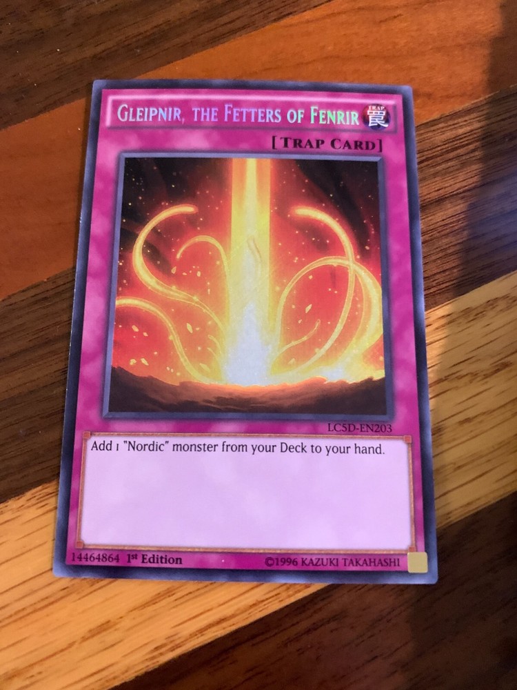 Hello! You are buying one Gleipnir, the Fetters of Fenrir LC5D-EN203 1st Edition Secret Rare in lightly played condition. Reason for lightly played condition is minor general play/scratchwear mostly on back. See photos for details! As a thank you for buying from me, I will throw in two free Yugioh commons! Thank you so much for looking, have a great day! If there is ever an issue, please let me know so I can do whatever I can to resolve it! Please check out my other items! I have many more single cards!