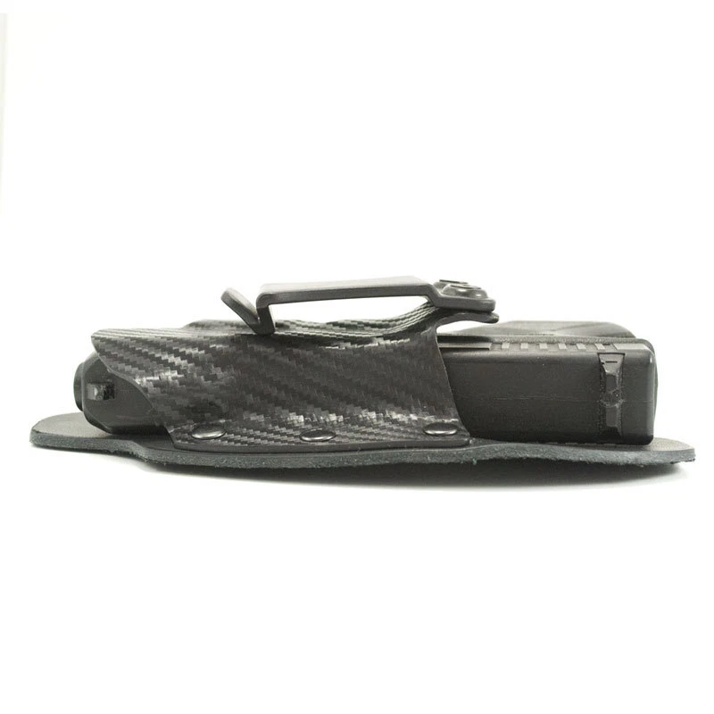***LEFT AND RIGHT HAND AVAILABLE*** Outlaw Holsters is proud to provide our customers with high quality, handmade Kydex and Leather Holsters. Each holster is hand crafted in the USA. Our Inside the Waistband (IWB) holster is made out of a light weight .080 Kydex material that has been field tested and proven to be extremely durable in many conditions. Our IWB Hybrid design has a leather backing that is smooth and comfortable against your body. CONCEALMENT CARRY : This Kydex & Leather Hybrid (IWB) Inside the waistband holster is designed specifically for concealment carry. The design is intended to maximize comfort and protect the finish of your firearm while making it easily accessible in a variety of situations. PLEASE NOTE THAT DEPENDING ON THE SIZE OF YOUR GUN, IT WILL DETERMINE THE SIZE OF THE HOLSTER. PLEASE LOOK AT THE OTHER PHOTOS FOR CONFIRMATION. We ship daily Monday - Friday via USPS. We do NOT ship on weekends or holidays so please keep this in mind. Most orders are shipped within the SAME or ONE business day of you placing your order. Orders placed on Friday, Saturday or Sunday will ship out Monday. If you are experiencing a delay, please contact us. HOLSTER FEATURES & SPECS: - .080" Kydex Front molded to fit your gun. - 9 oz. Drum Dyed & Sealed Leather Back - Leather is sweat and water resistant. - 1 1/2" Fixed Belt Clip is made of injection molded plastic. Will not damage your belt. Non-Tuckable. - Made in the USA * This holster is not intended to be used on the outside the waistband.