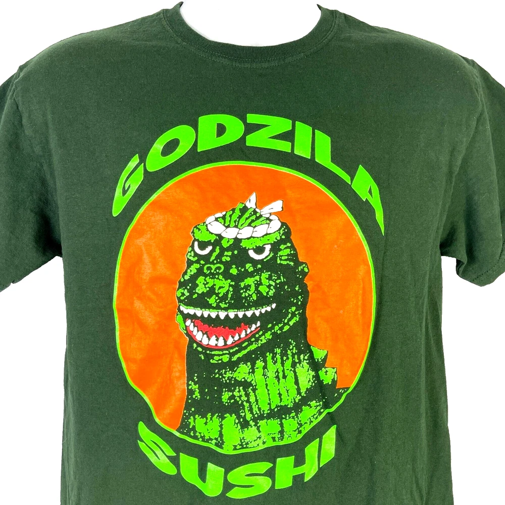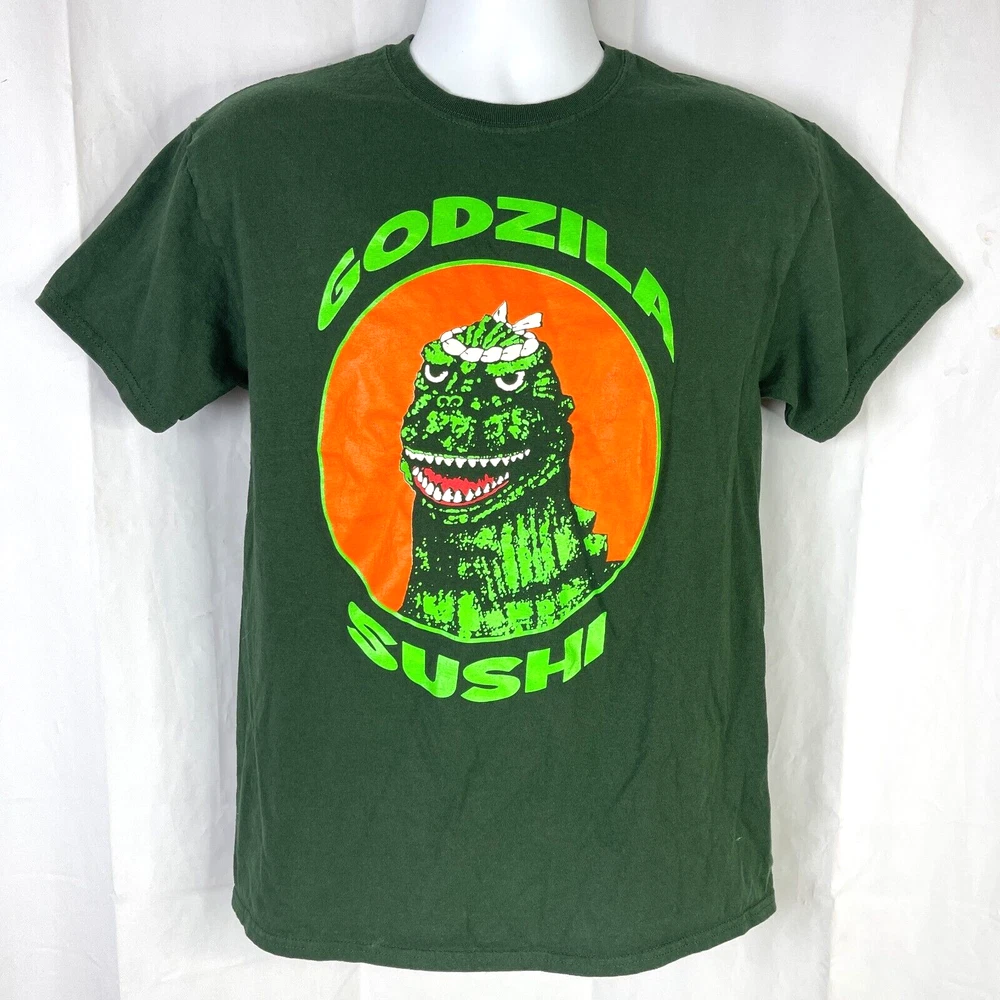 GODZILA SUSHI Restaurant T-Shirt; Men's (Medium) classic Godzilla kaiju mascot for this popular San Francisco joint True Fit: CHEST 39 in / 99 cm LENGTH 27 in / 69 cm VG condition; gently pre-owned and well maintained w/a few scuffs on graphic (seems hardly worn at all, actually)/ no neck tag