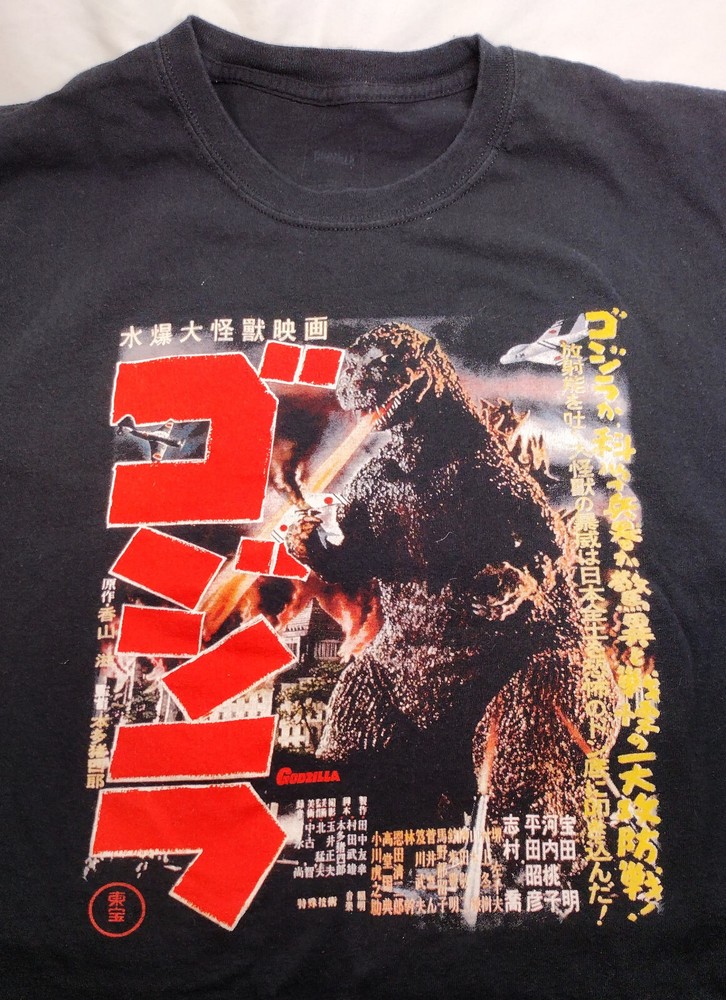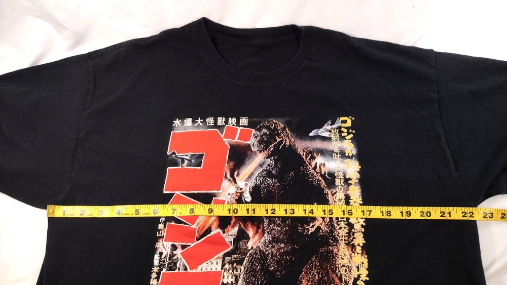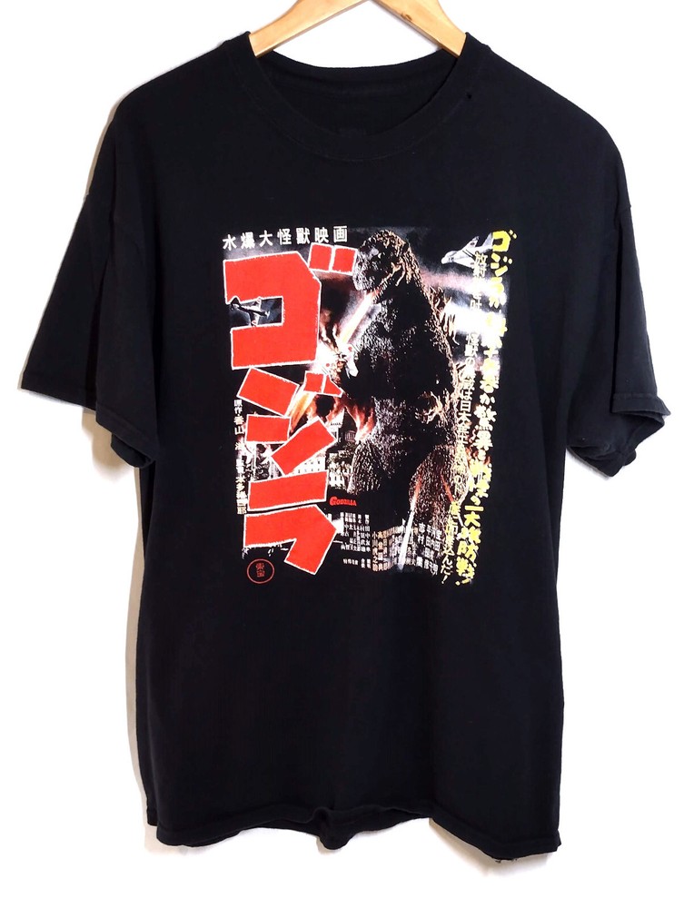 Good condition Gojira Godzilla poster Tee Shirt. Pre-owned, size Medium (see photos for measurements). One small hole near shoulder seam (pictured).
