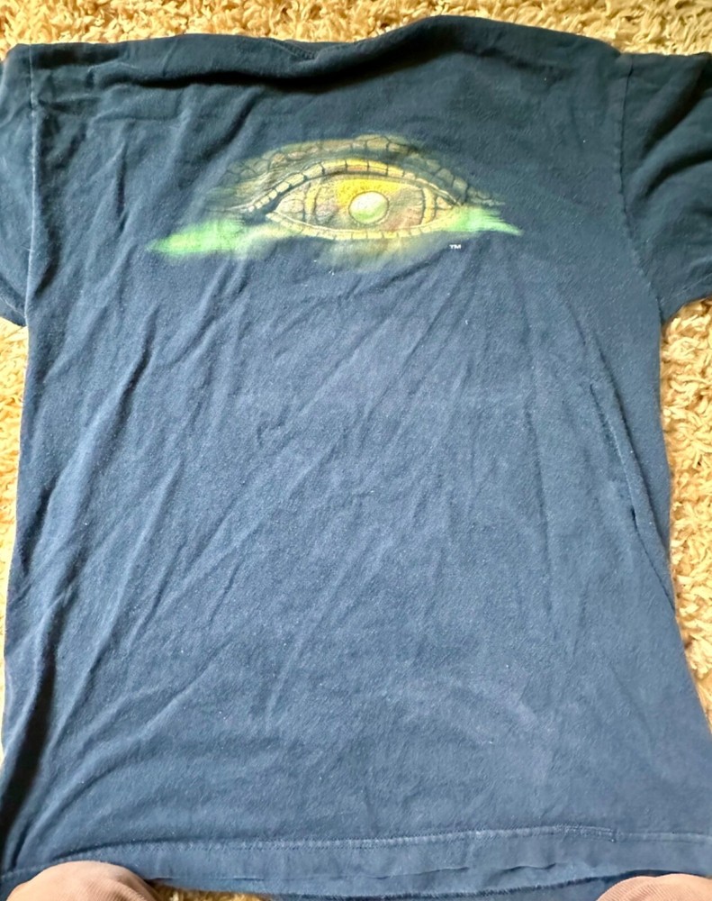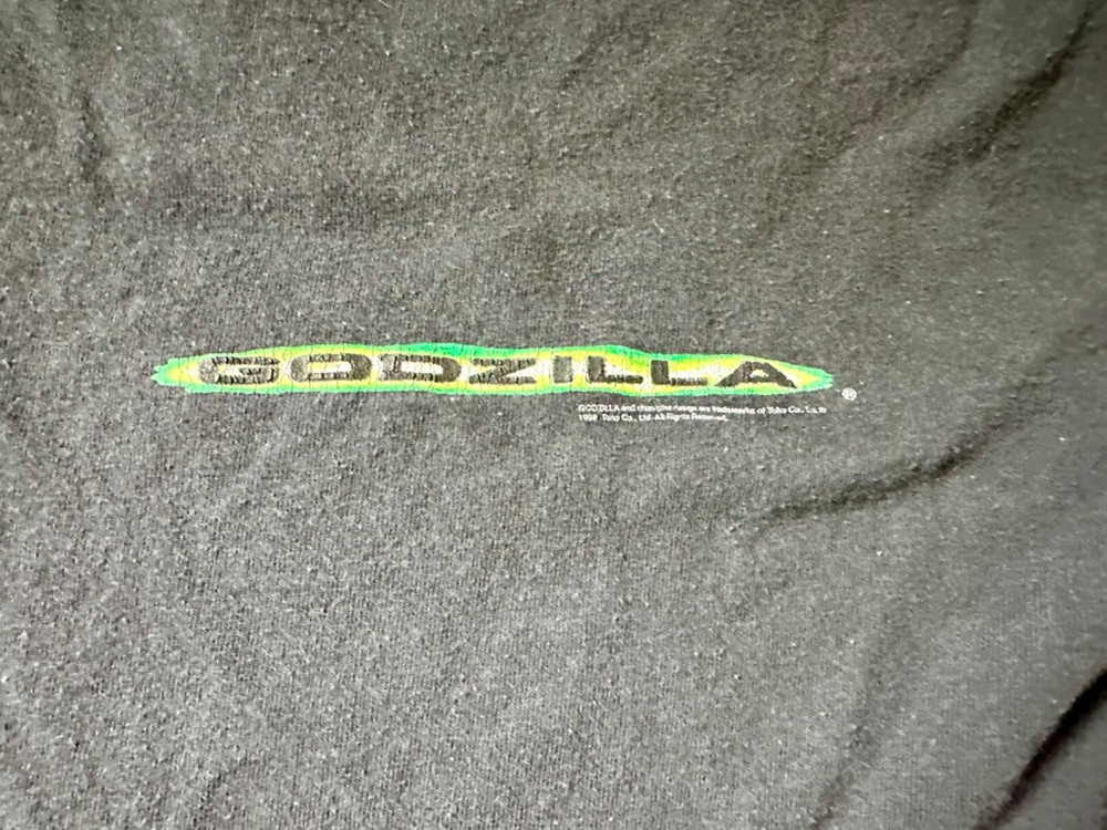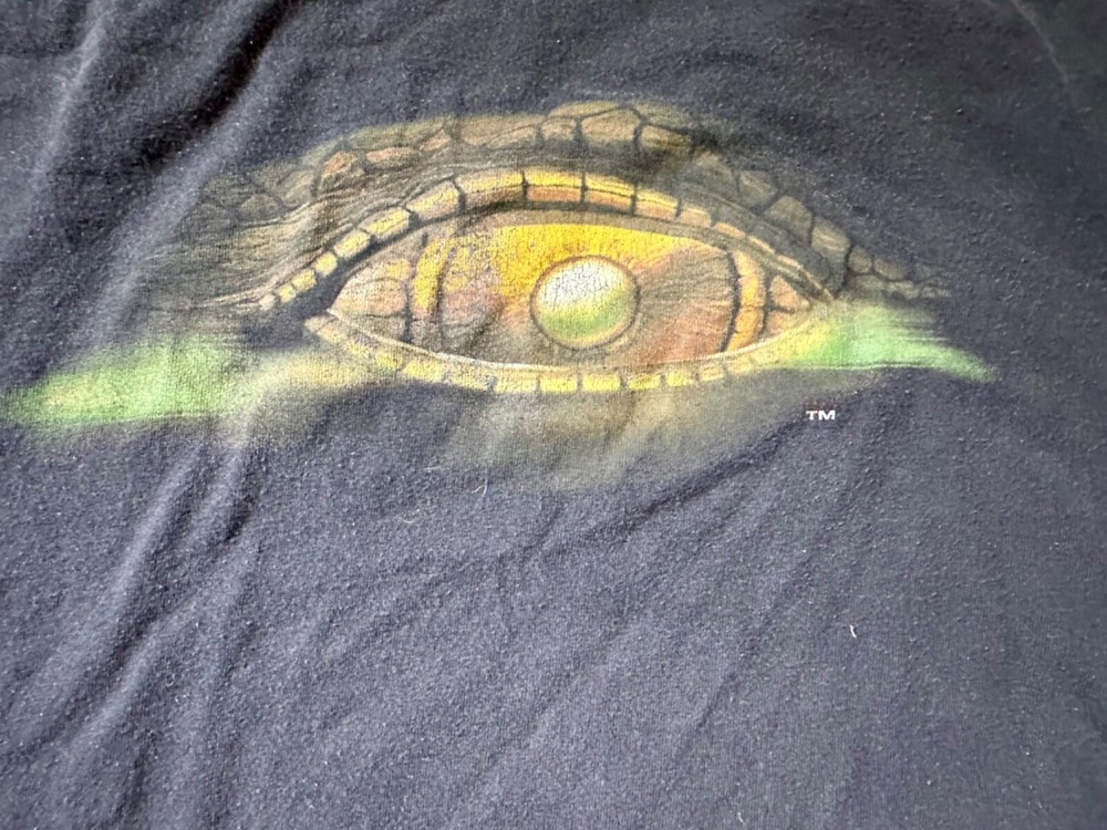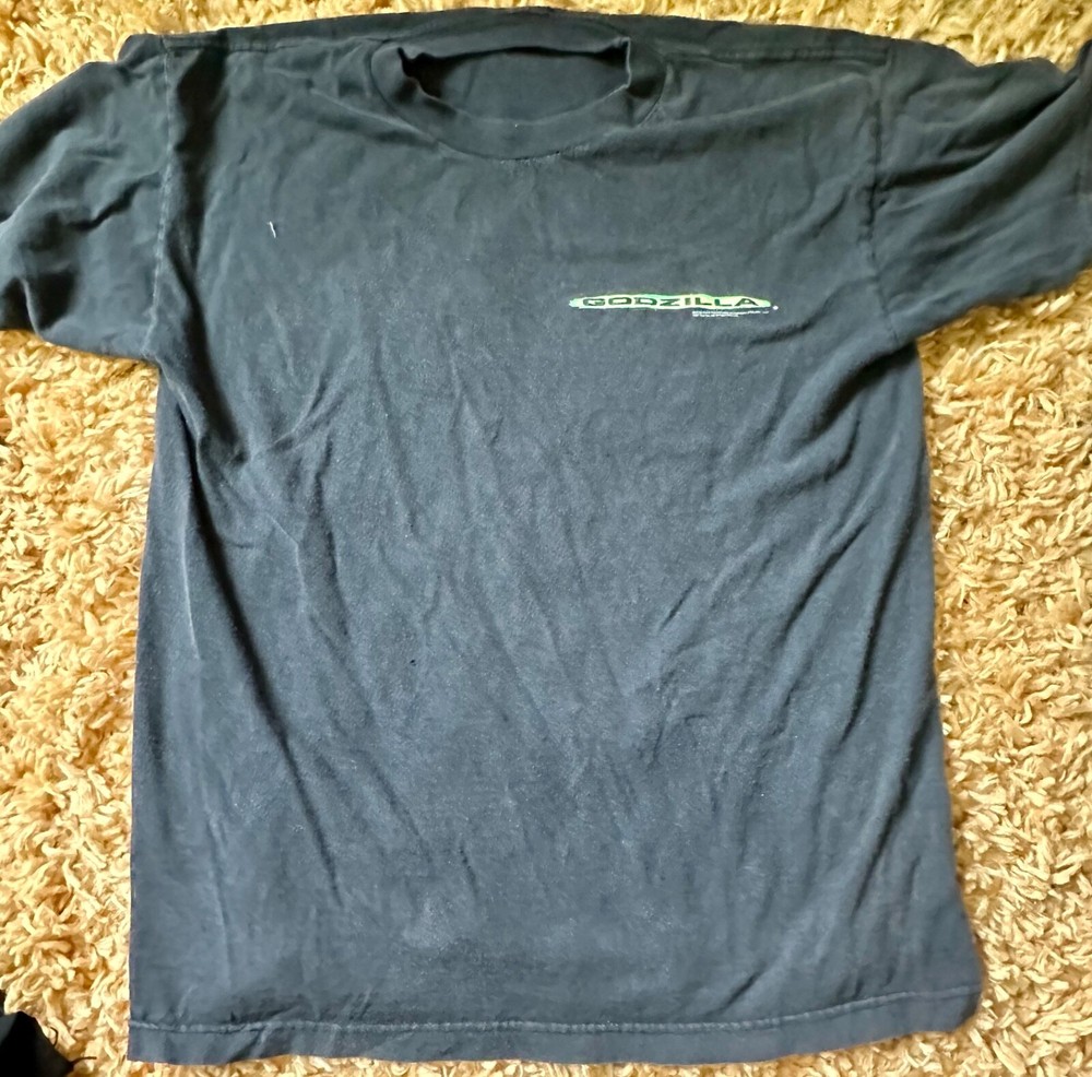 Promotional T-Shirt for the book tie-in to the 1998 Godzilla movie. A HarperPrism Press promo! RARE, a little faded & stretched but nice! Great evil eye on back. 21" X 21" pit to pit.