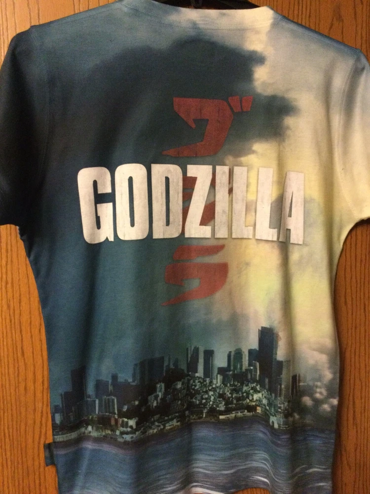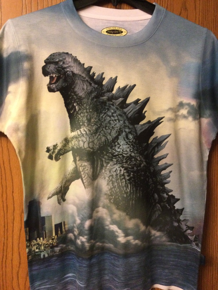 Godzilla - (All Around Print). M.. Condition is "Pre-owned". Shipped with USPS First Class. Pit to Pit. 22.5” Length. 27.5” Please note entire descriptions with measurements and whether item has any flaws. Shirts may vary in size. All shirts are washed unless new. Smoke Free.