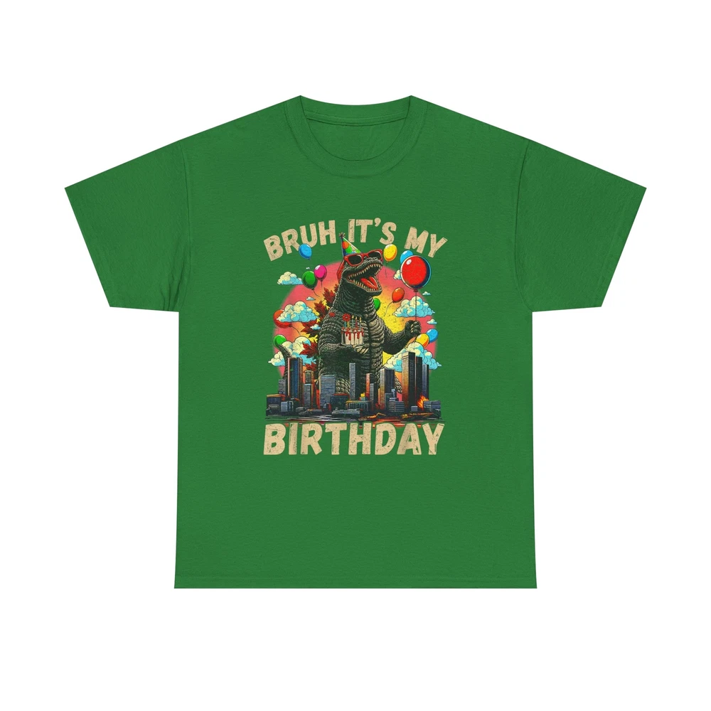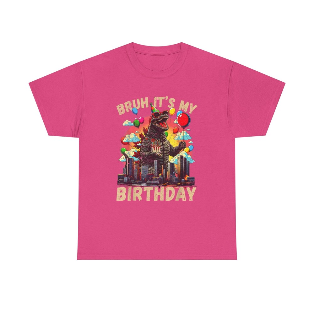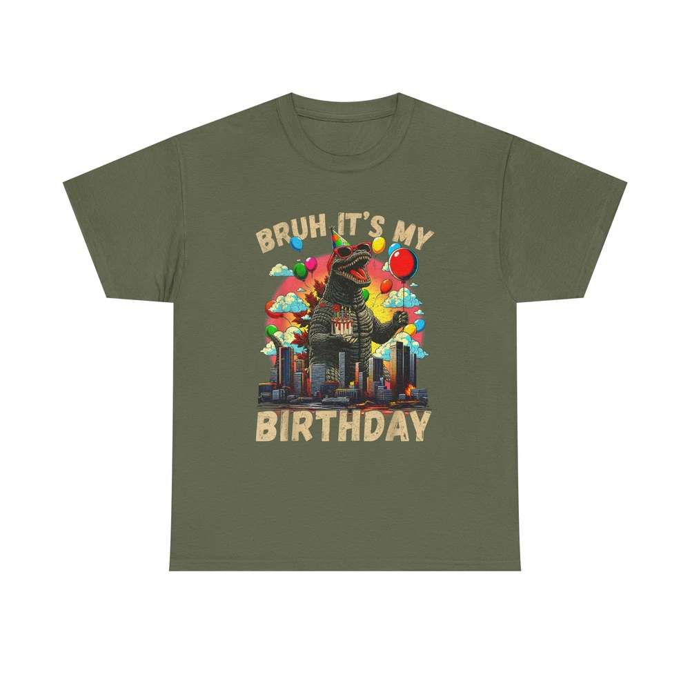 A fun and playful t-shirt design featuring Godzilla with the phrase 'its my birthday bruh'. Perfect for those who love Godzilla and want to celebrate their birthday in a unique way. This t-shirt is great for casual wear or as a statement piece at birthday parties and celebrations. Product features - Shoulder tape for stability - Tubular knit construction without side seams - Ribbed knit collar for elasticity - Made from strong and smooth fabric for printing - Classic fit for comfortable wear Care instructions - Non-chlorine: bleach as needed - Do not iron - Do not dryclean - Machine wash: cold (max 30C or 90F) - Tumble dry: low heat
