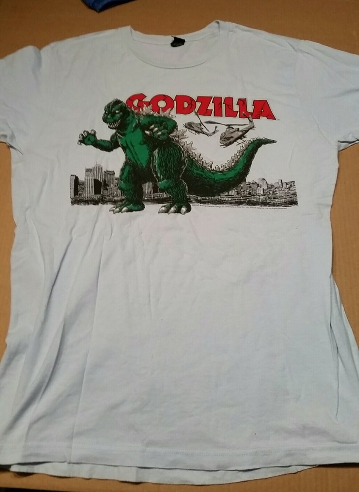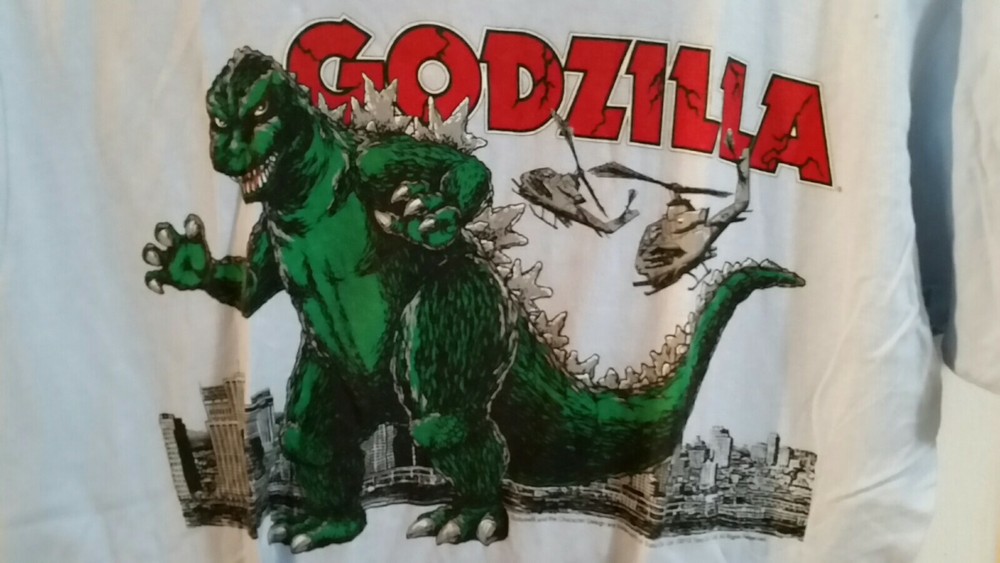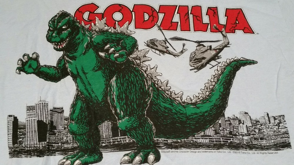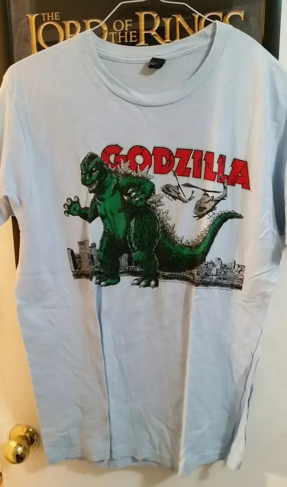 Excellent like new condition pre-owned Men's Godzilla Helicopter Air Strike Graphic T shirt Officially Licensed by Impact Merchandising. Sky Blue/Light Blue Color. Size Large. Excellent condition (worn only a few times and in storage since). Graphic tee printed on Light/Pale Blue Tultex 100% preshrunk soft jersey cotton. Measurements Chest (armpit to armpit) width: 21.25 inches Length (top center back collar to bottom hem): 28.5 inches A very rare, sold out & discontinued Godzilla item originally released in the merchandising blitz leading up to 60th anniversary of the King of the Monster and the USA Warner Bros. Godzilla film in 2014. Please contact me for any question.