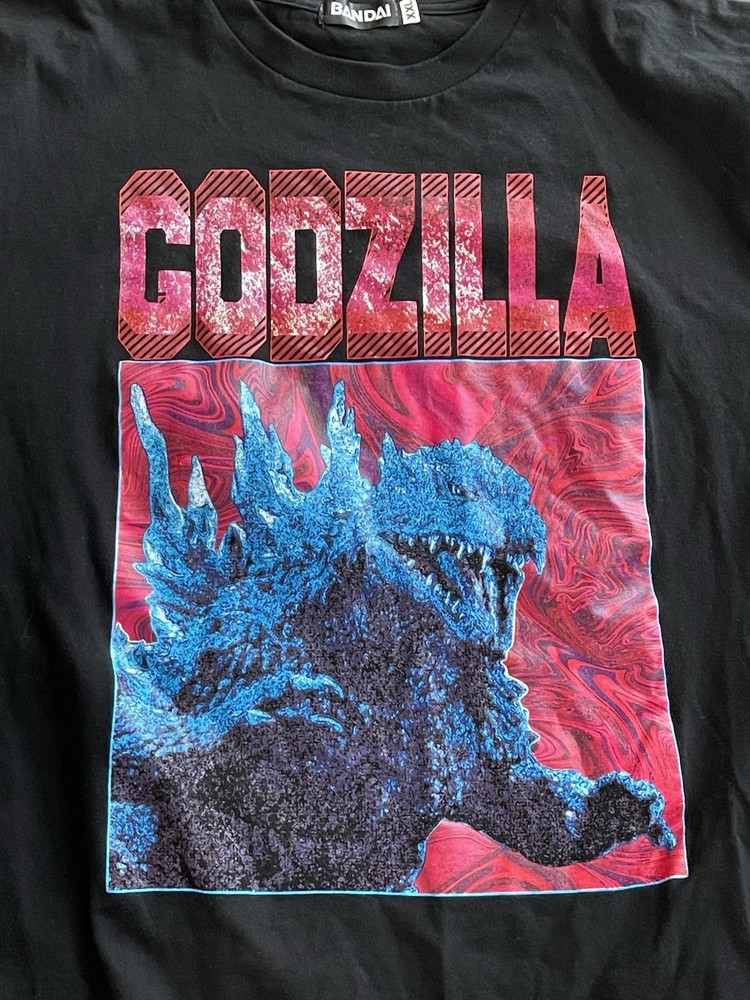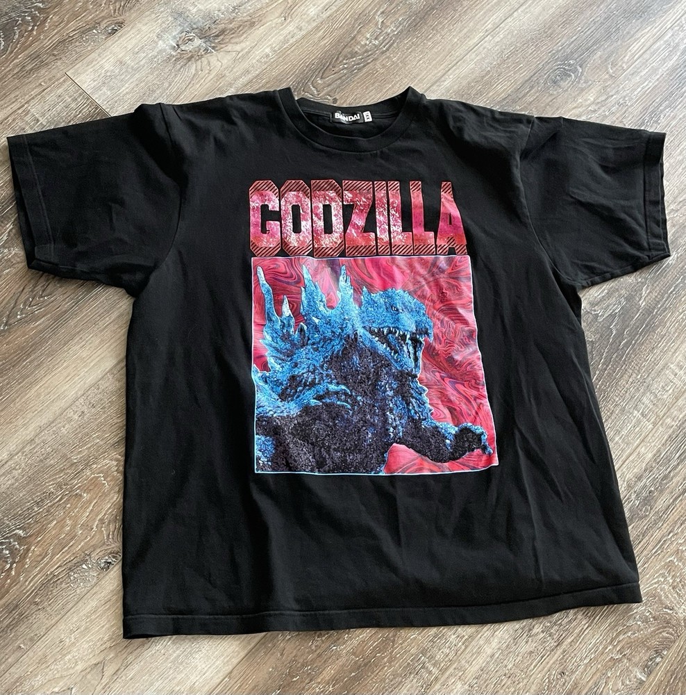 This black T-shirt features a design of Godzilla. The shirt is made of cotton and has short sleeves, making it comfortable to wear. It is a regular size 2XL, suitable for unisex adults. The shirt is officially licensed by Bandai.