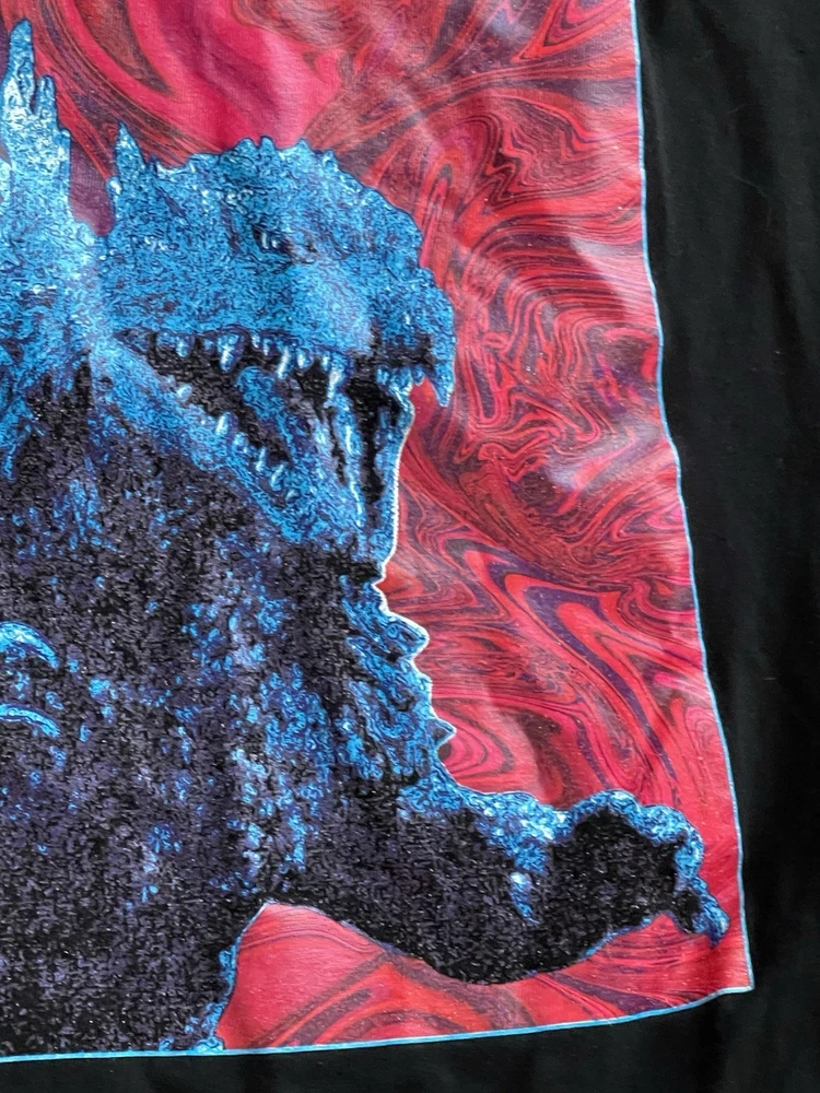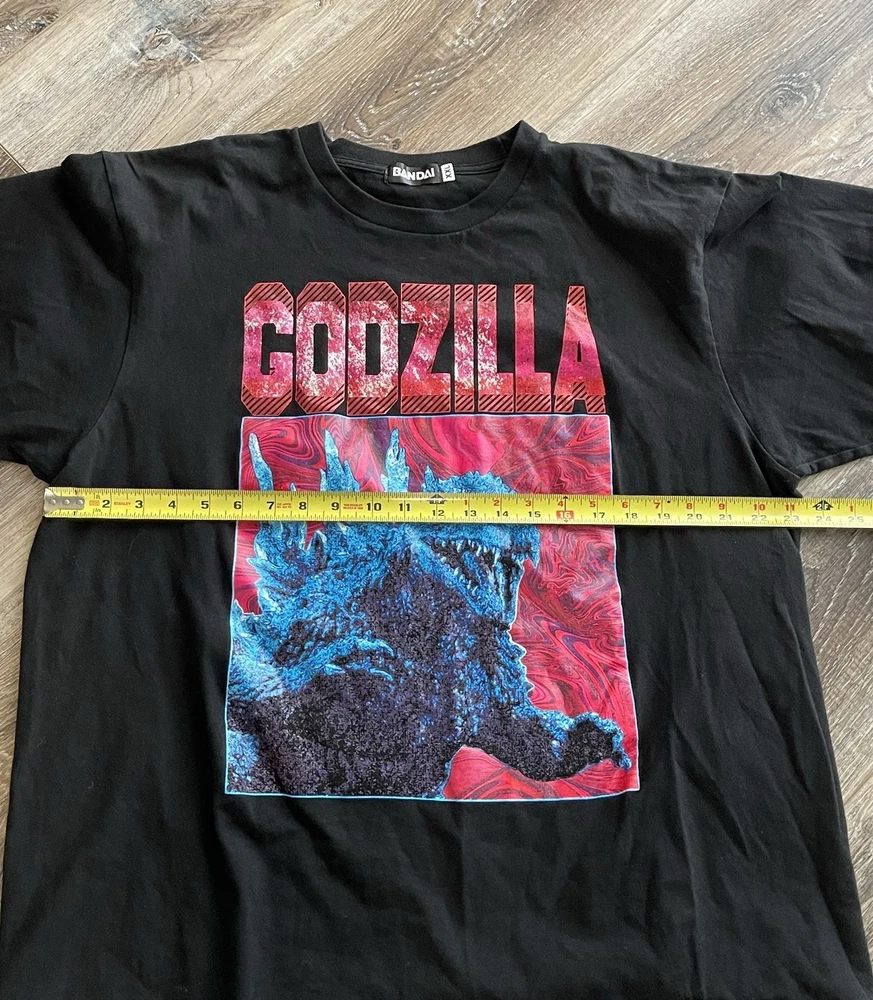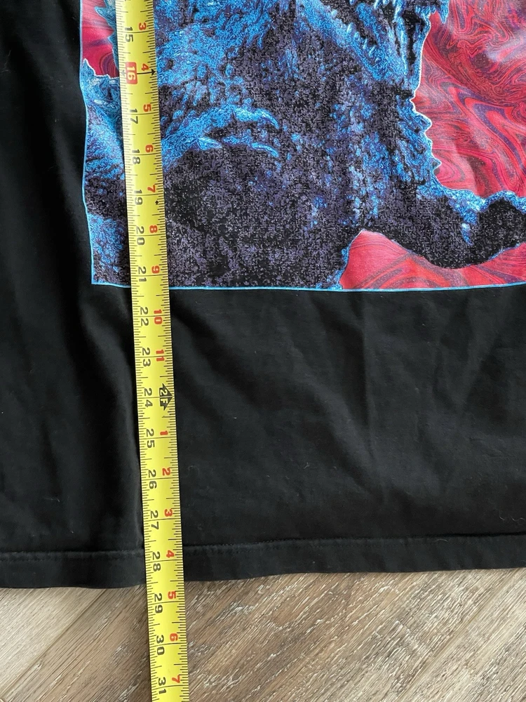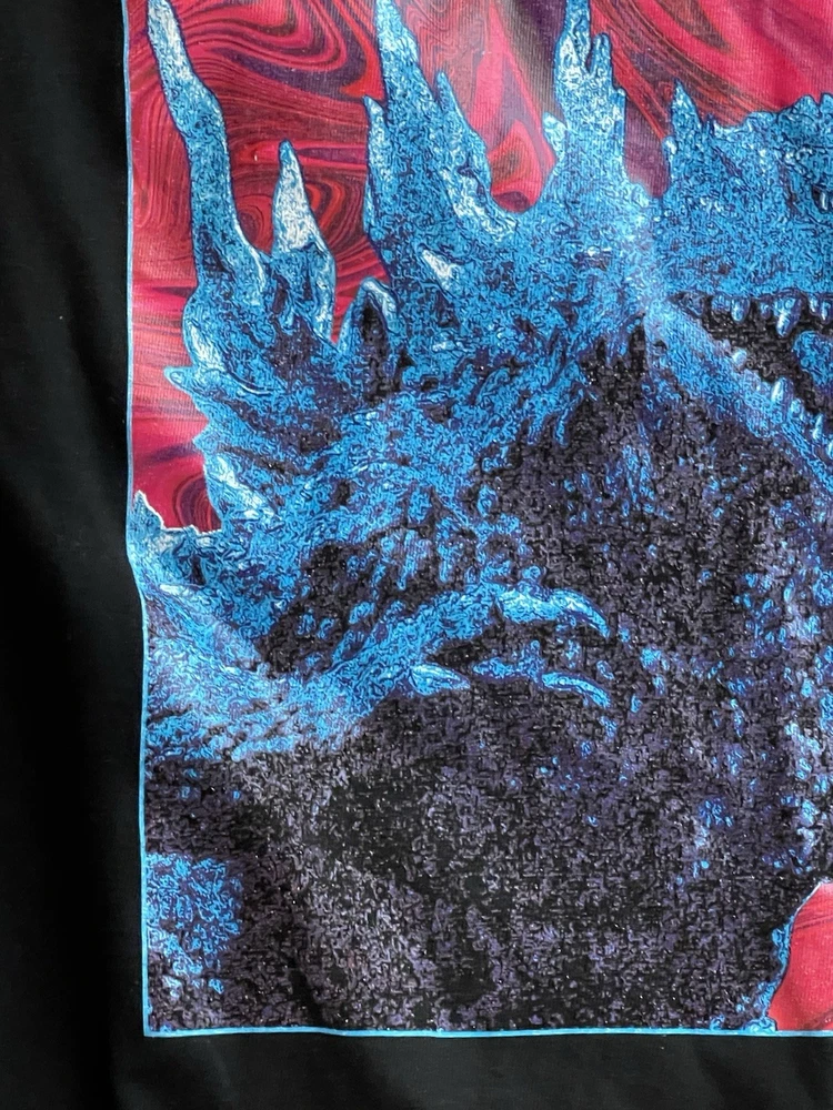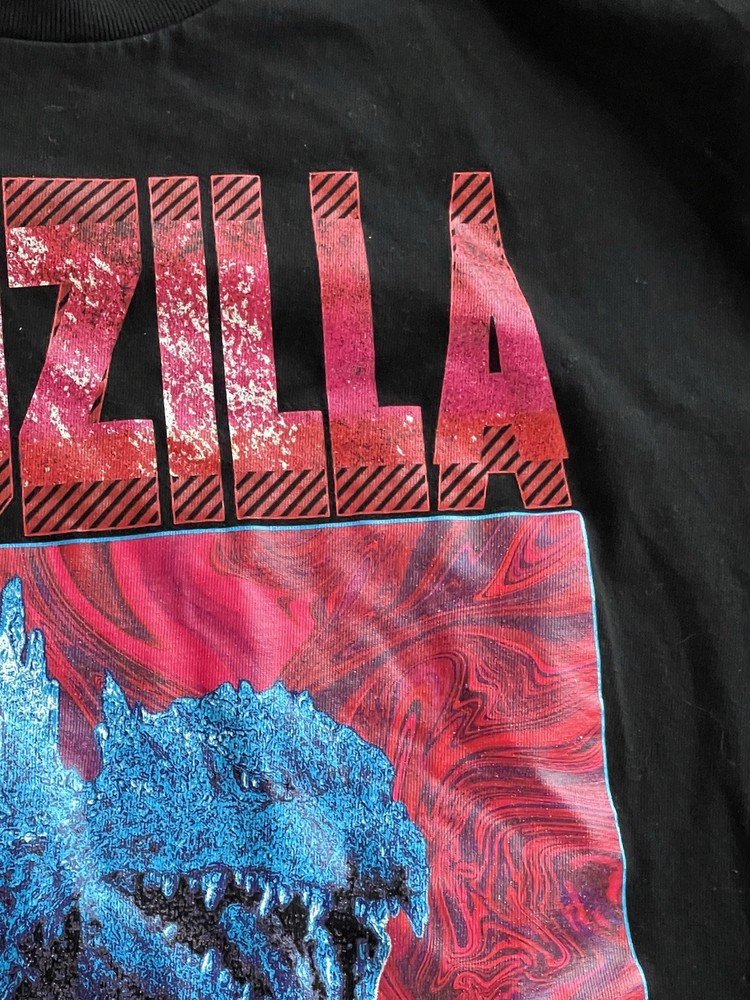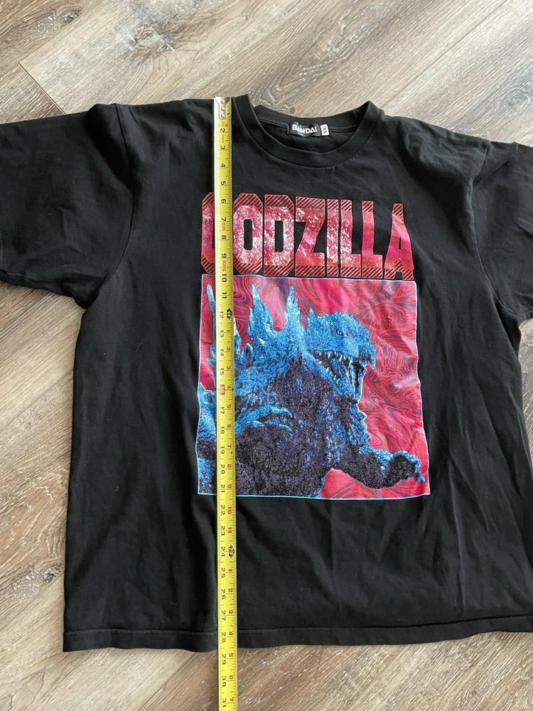 This black T-shirt features a design of Godzilla. The shirt is made of cotton and has short sleeves, making it comfortable to wear. It is a regular size 2XL, suitable for unisex adults. The shirt is o...