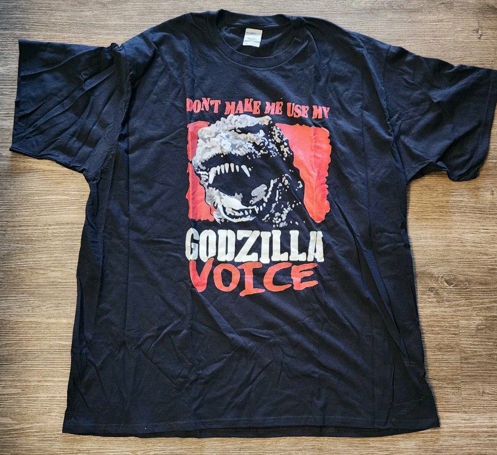 This Godzilla-themed t-shirt is a must-have for any fan of the classic movie monster. Featuring a graphic print of Godzilla's face, this unisex adult t-shirt is made of comfortable cotton jersey fabric and has a crew neck and short sleeves. The shirt is machine washable and easy to care for, making it perfect for all seasons. With a regular fit and available in size 3XL, this t-shirt is perfect for anyone who wants to show off their love for Godzilla. Whether you're going to a movie screening or just out and about, this t-shirt is sure to make a statement. Get yours today and don't make me use my Godzilla voice!