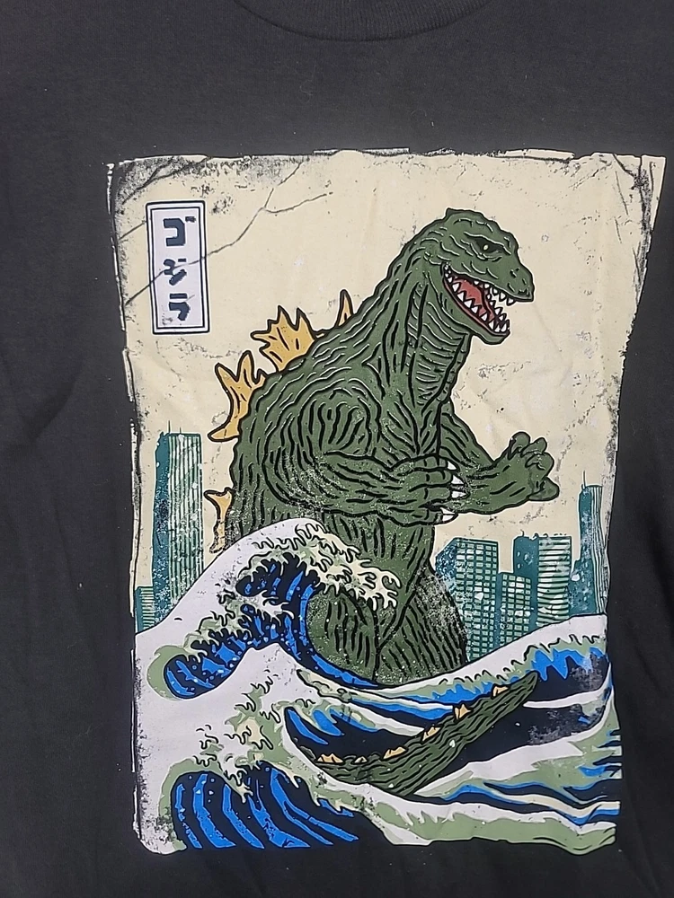 This Godzilla Great Wave Kanagawa T-Shirt is a must-have for fans of the classic monster and Japanese art. The shirt features a crew neck and short sleeves, with a slim fit that is perfect for any season. The black cotton fabric is soft and machine washable, making it easy to care for. The shirt has a graphic print that features the iconic Gojira, Kaiju, and Godzilla characters, as well as the Great Wave Off Kanagawa and Big Wave designs. The mashup art style adds a unique touch to this classic retro tee. This T-Shirt is perfect for anyone who loves monster movies and Japanese art. *Please See Photos For Condition Ask Questions Sold As Is*