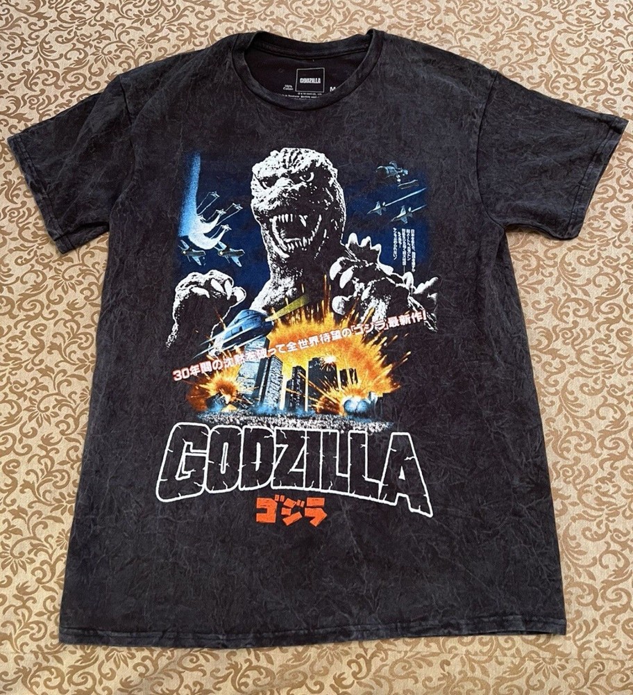 NEW WITH TAGS! Show off your love for anime with this Godzilla Japanese design graphic T-shirt. Made of 100% cotton fabric, this regular fit T-shirt features short sleeves and a crewneck neckline. The black color and anime theme make it a great addition to any wardrobe. This T-shirt is perfect for fans of the Godzilla franchise and anime enthusiasts alike. The shirt is made in China and is not handmade. It is available in size M and is a great choice for any man who wants to add a touch of anime style to their wardrobe.
