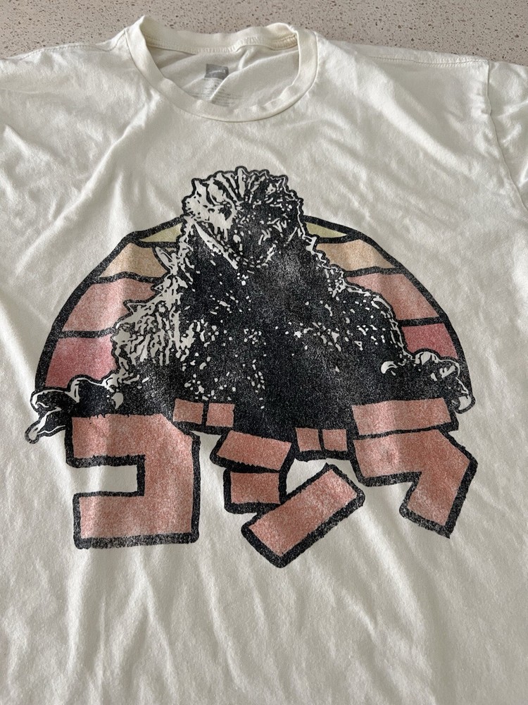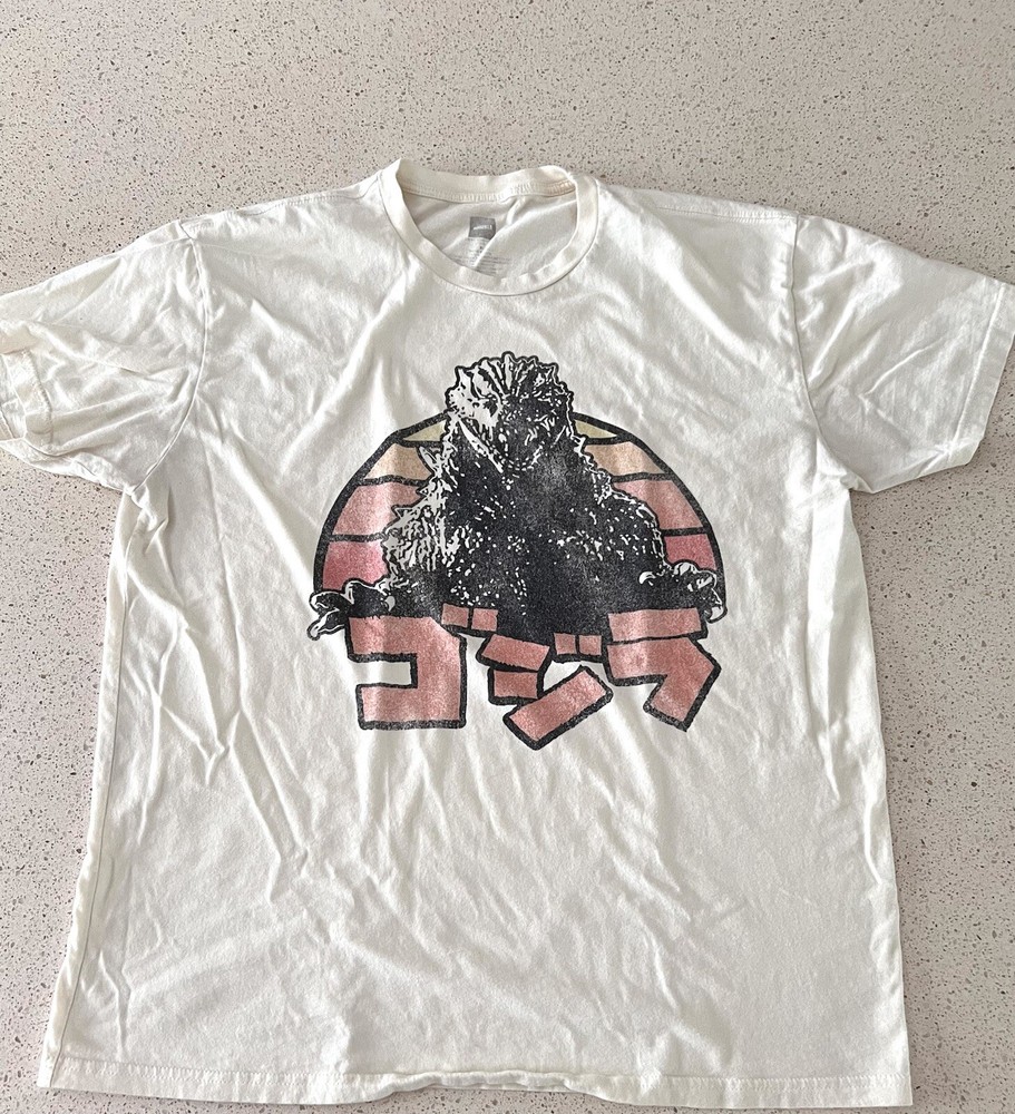This Godzilla Japanese graphic t-shirt is a must-have for any fan of the iconic movie character. The beige color and solid pattern make it a versatile piece of clothing that can be worn in all seasons. The short sleeve and crew neck design ensure comfort while the cotton fabric type guarantees durability. The t-shirt is machine washable, making it easy to maintain. It features a graphic print of the Godzilla character, making it a perfect addition to any movie-themed outfit. This pre-owned t-shirt is available in size XL and is a regular fit for men. Get your hands on this Godzilla t-shirt today and show off your love for the movie character! Measures 22 inches from pit to pit. From shoulder to hem is 28 inches.