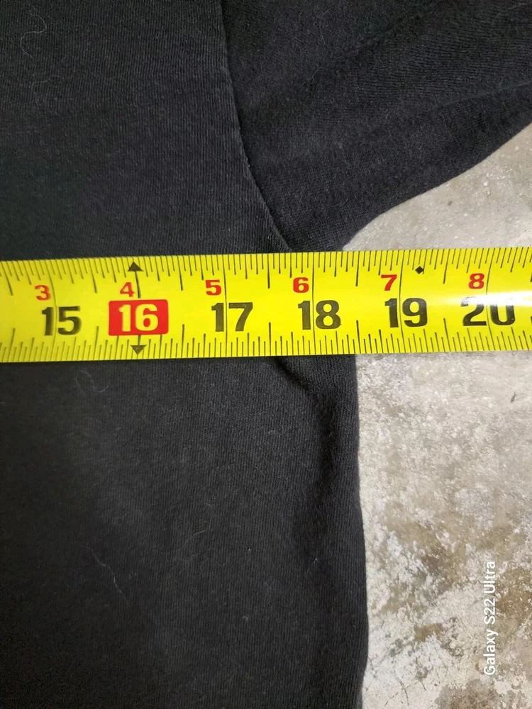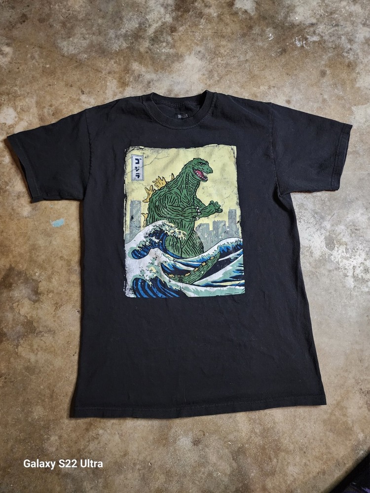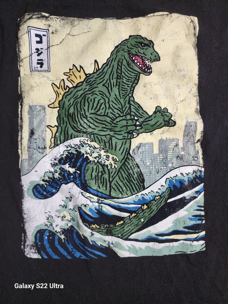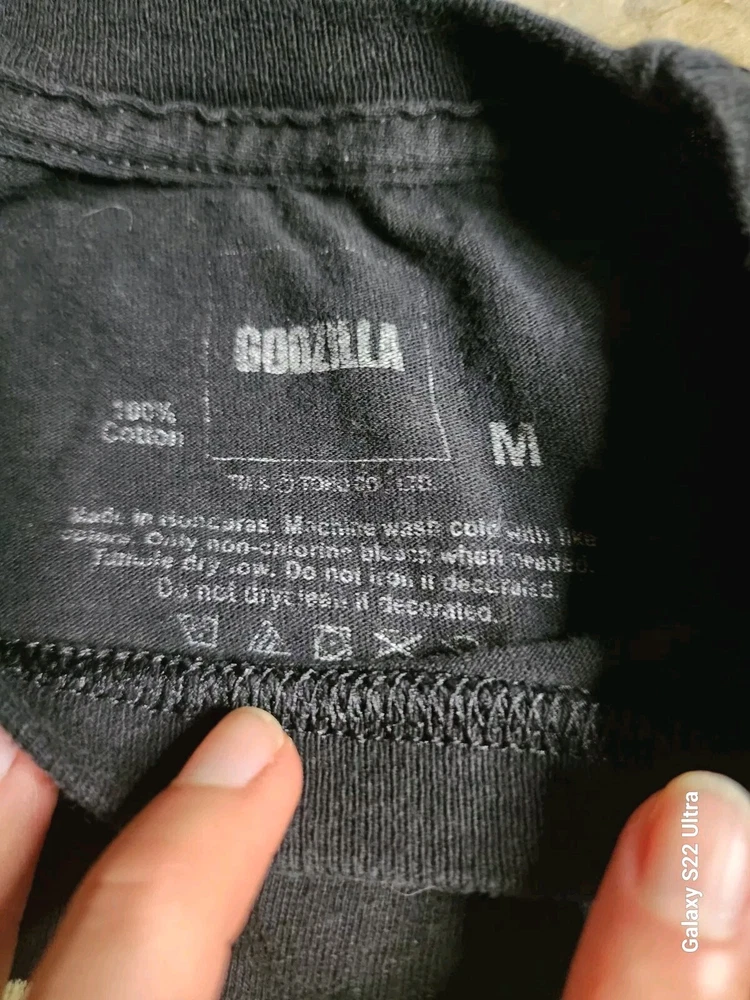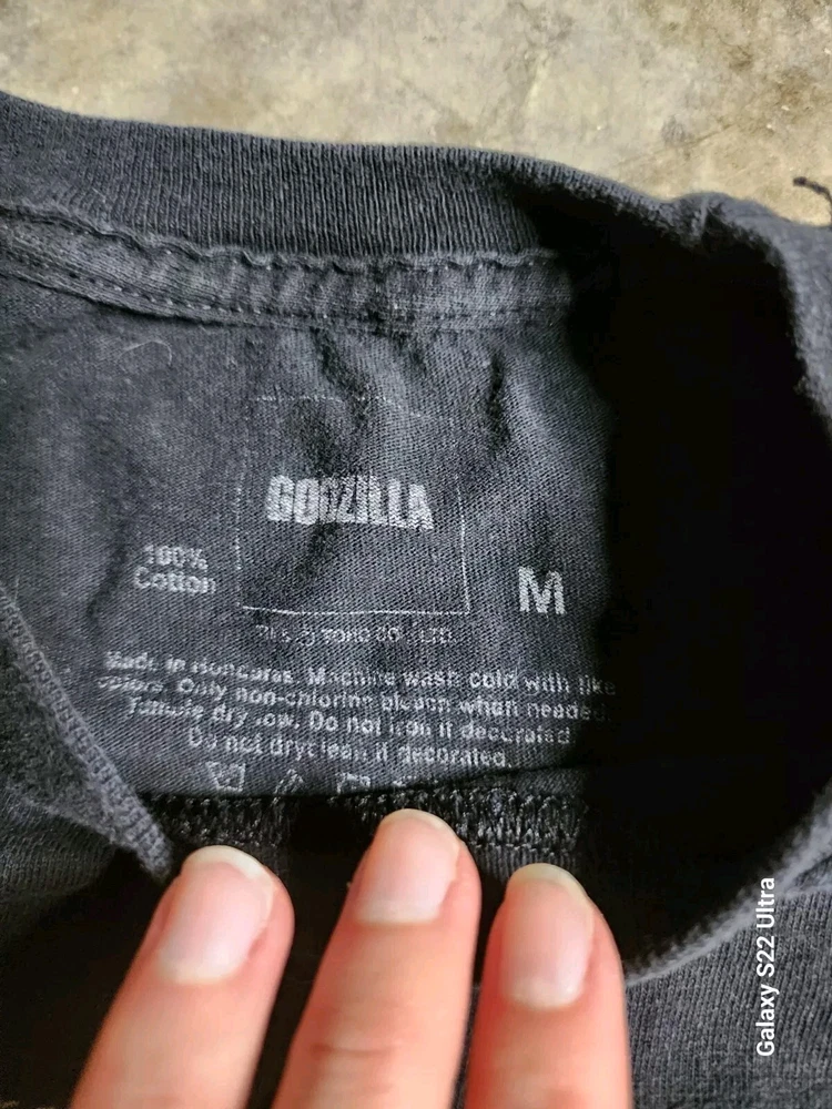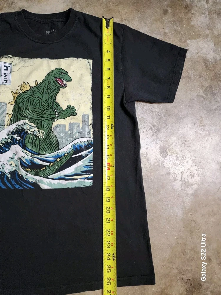 Show off your love for the King of Monsters with this black Godzilla t-shirt. The short sleeve shirt is perfect for summer, fall, or spring and features the iconic Godzilla character on the front. The shirt is made for unisex adults in size M and has a regular fit. The garment care is easy with this t-shirt as it is machine washable. The shirt is ideal for fans of the Godzilla franchise and is a must-have addition to any wardrobe. Get ready to show your love for the King of Monsters with this stylish and comfortable t-shirt. NOTICE: SMALL HOLE UNDER LEFT ARMPIT. SEE PICTURES FOR EXACT MEASUREMENTS