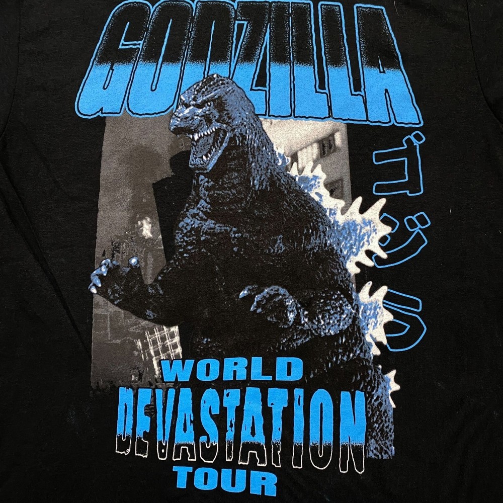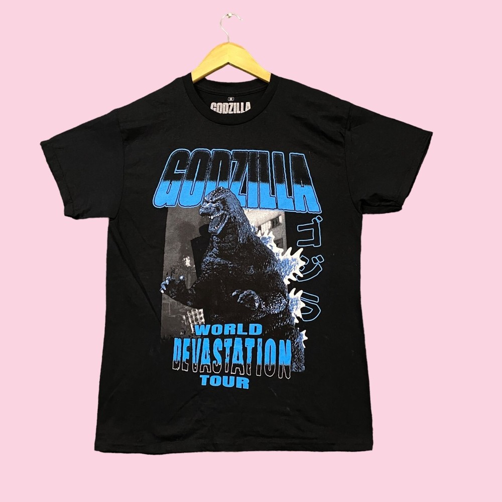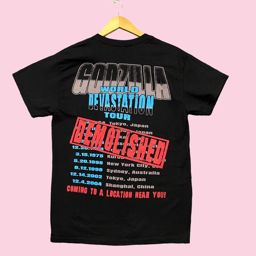 Godzilla King of the Monsters World Devastation Tour Demolished Tee M measures 20 inches pit to pit 27 inches long Amazing tee with graphics on both sides of the shirt perfect for Godzilla fans Firsthand never worn overstock in great condition has markings from manufacturing process that may or may not wash off