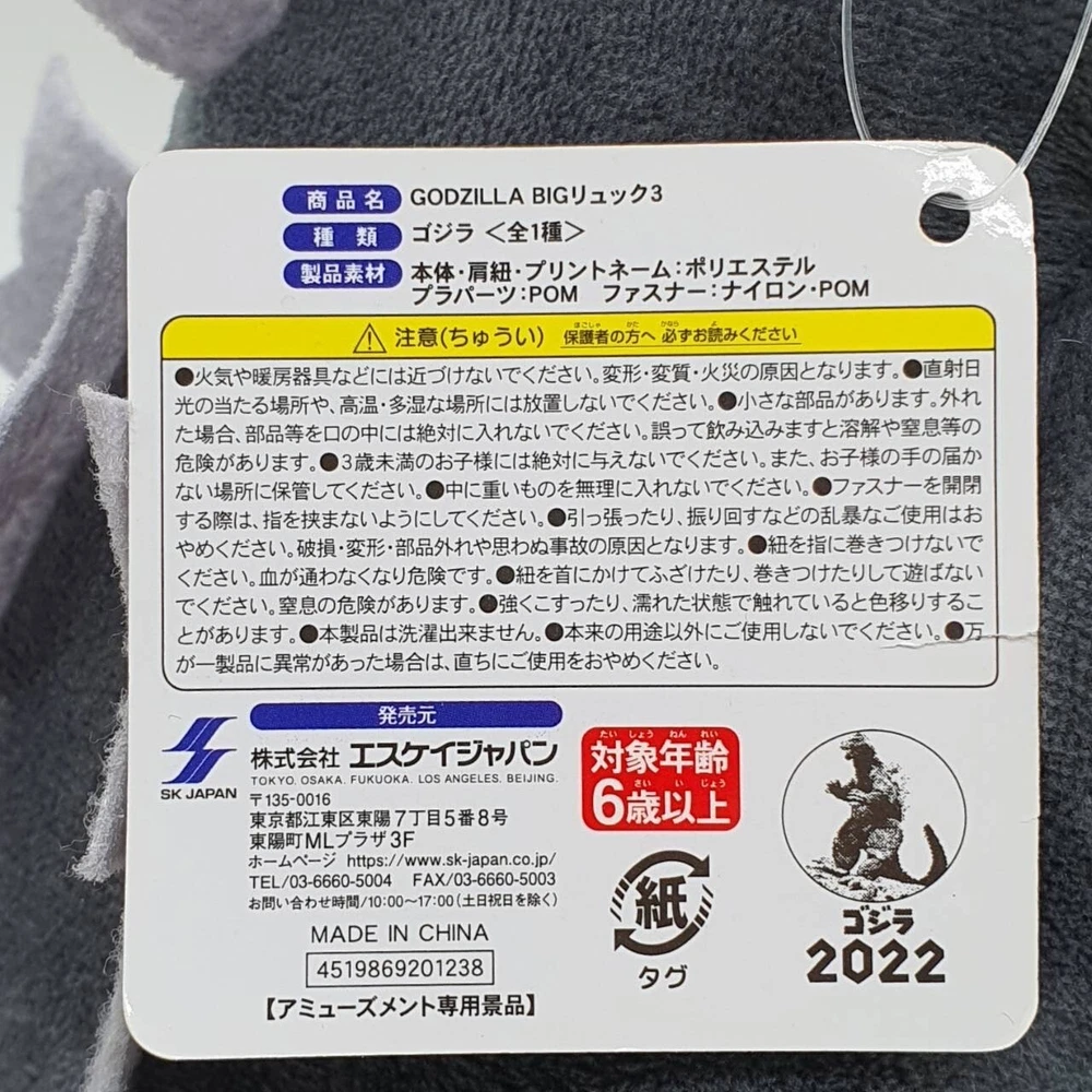 Godzilla L389 Stuffed Plush Backpack Toy 12 Inch Japan SK Doll
