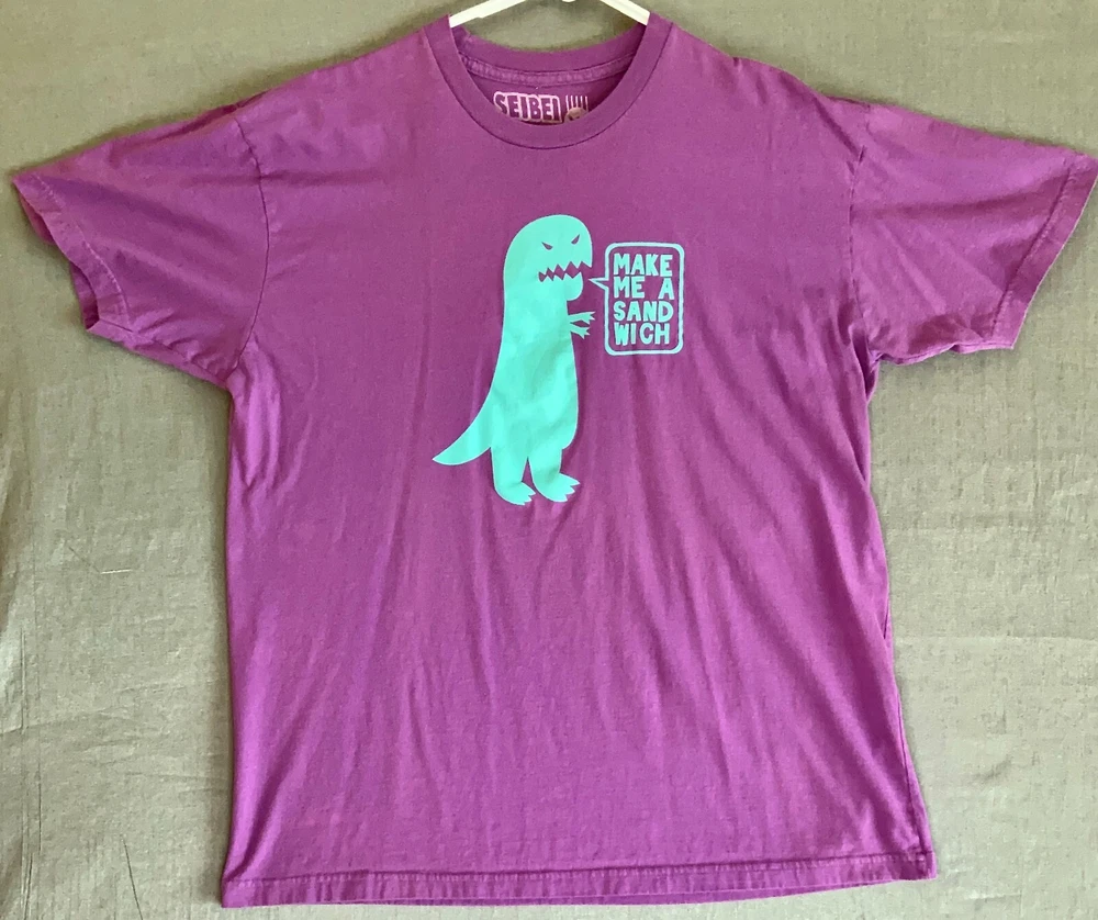 Dinosaur T Shirt Cartoon T Shirt Funny T Shirt Cute T Shirt Mens XL T Shirt This pre-owned t-shirt is in great condition. There are no fading, discoloration, or imperfections. This shirt shows normal wear and usage. Please see all the pictures, for the condition and description, and use the zoom. Feel free to ask for measurements if you are unsure the size will fit you. All items are pre-worn and sold AS IS unless otherwise noted in the listing. All items are cleaned prior to shipping Free Shipping is to the USA Domestic. I ship ASAP, within 1-2 business days, usually the next business day. Check my store, BEASTees Vintage, for our complete inventory. THANK YOU for you supporting my small business! Returns and Refund Policy. We accept returns for the following reasons: Wrong item received. Item not as described. Wrong size received or size tag on shirt not match item size description. Shirt does not fit. (e.g. too small , too large) Changed mind, does not like, etc. While we will gladly accept all returns, we will only pay for the return shipping for: Wrong item received. Item not as described. Wrong size received or size tag on shirt not match item size description. Return shipping cost will be deducted from your refund for the following reasons: Shirt does not fit. (e.g. too small, too large) Changed mind, does not like, etc.