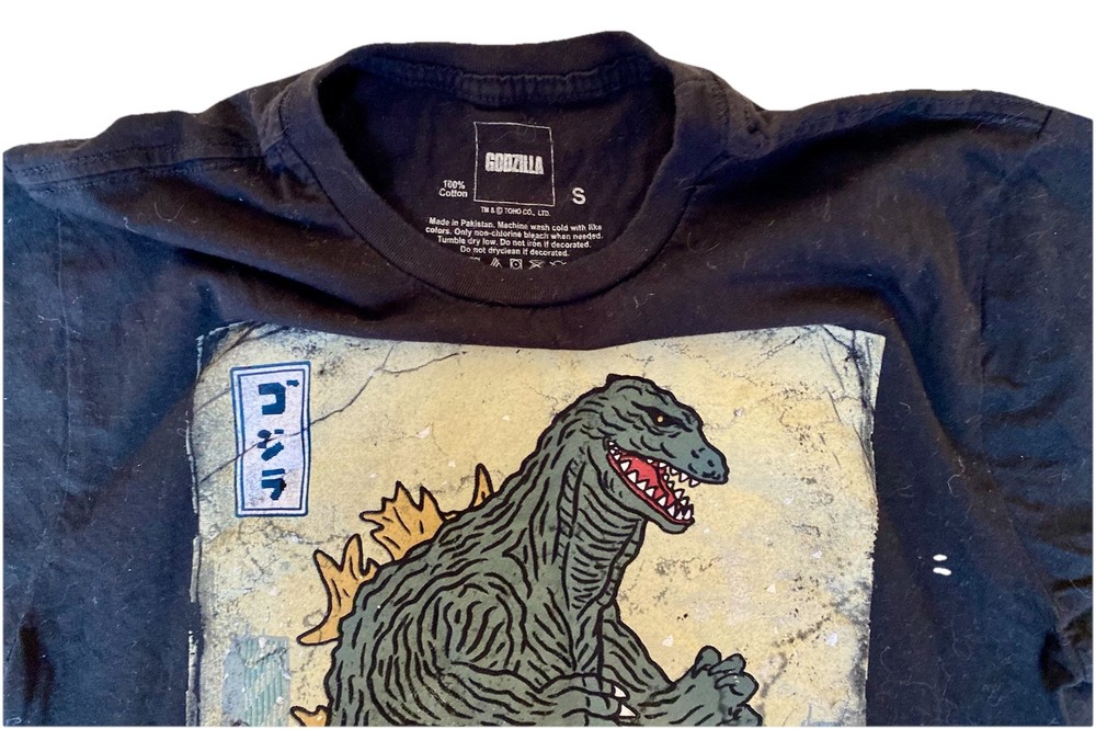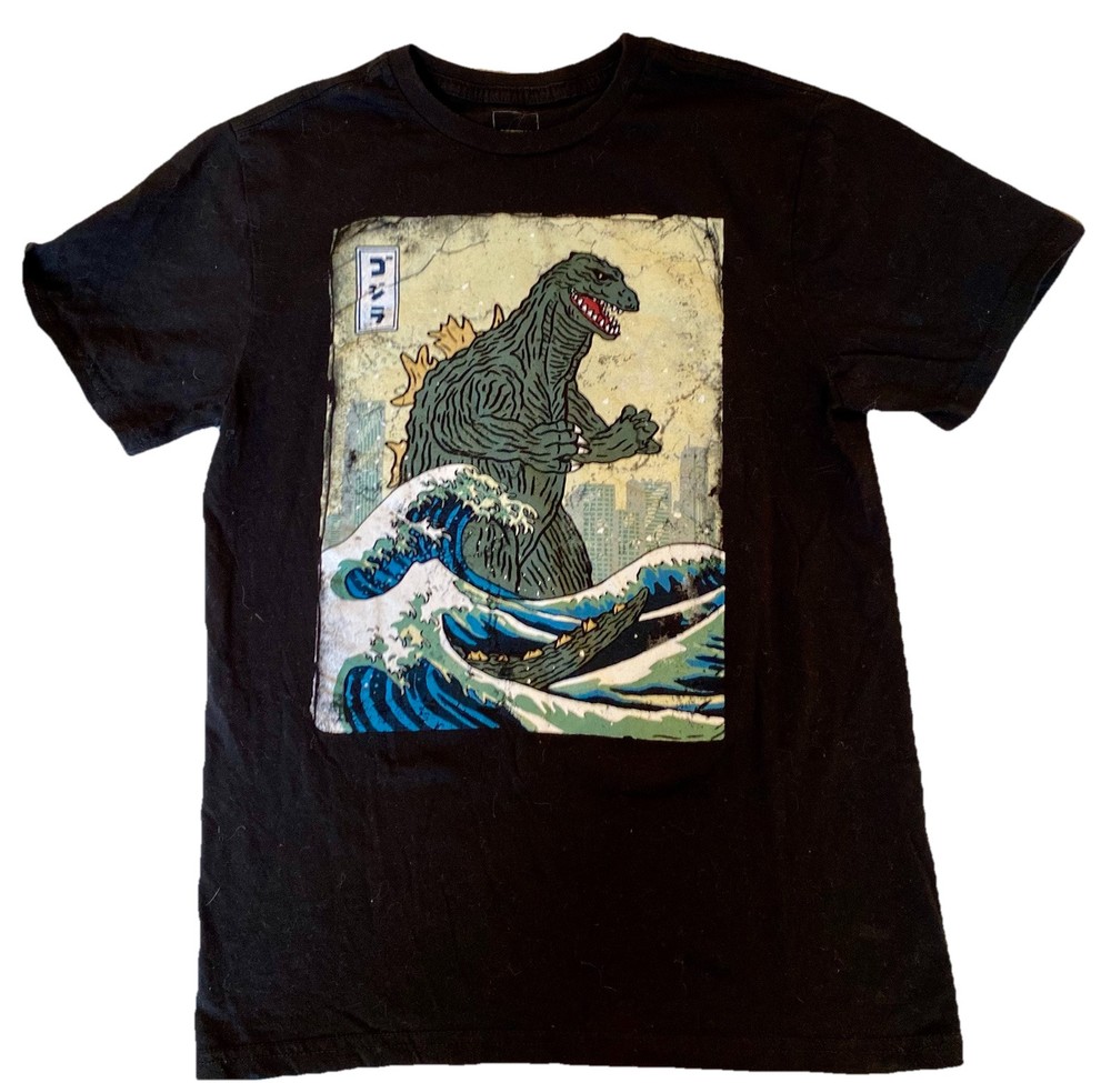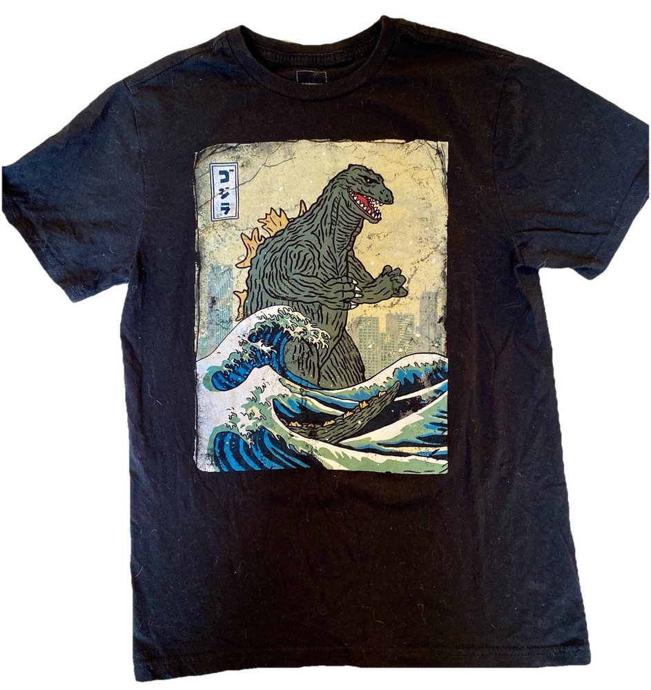 The "Godzilla Movie Great Waves T Shirt" is a men's black t-shirt featuring a graphic print of Godzilla, a character from the movie. Made of cotton fabric, this short sleeve shirt has a crew neckline and a regular fit in size small. It is machine washable and features the Monster Godzilla Toho logo, making it a stylish and comfortable choice for fans of the Godzilla franchise. Message seller for questions!! Thanks for looking!!!