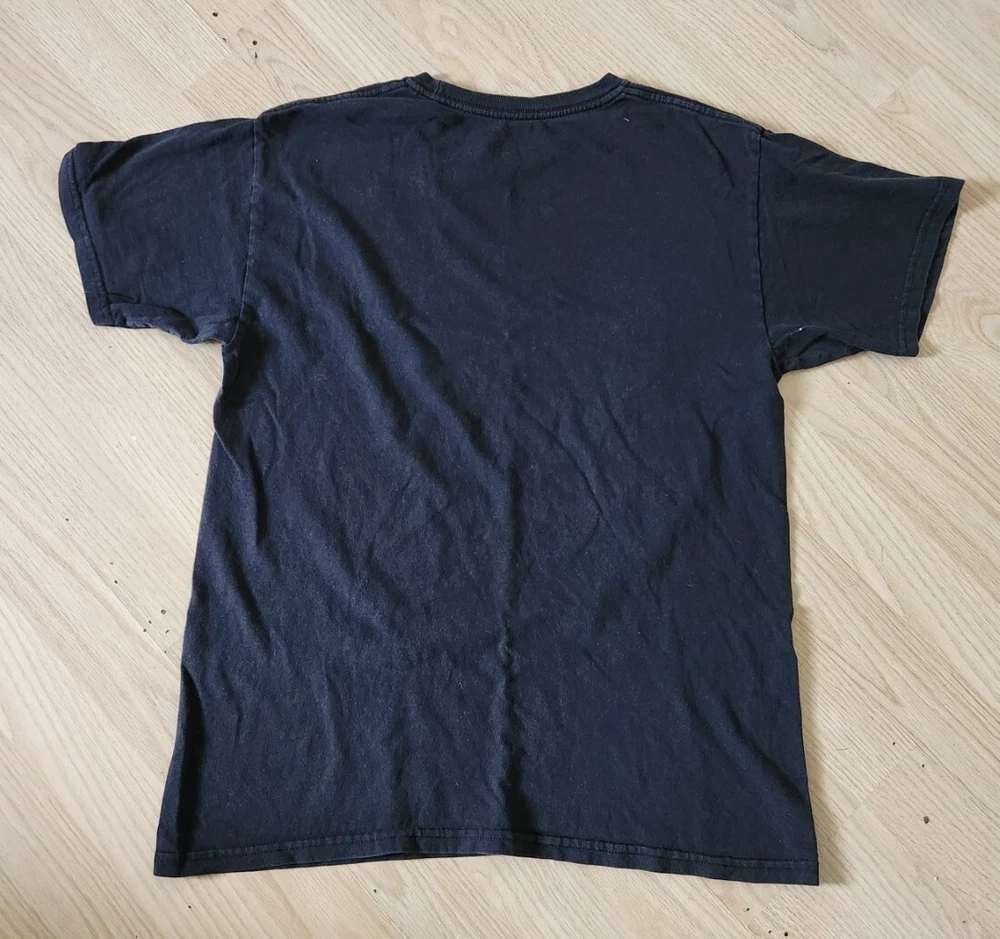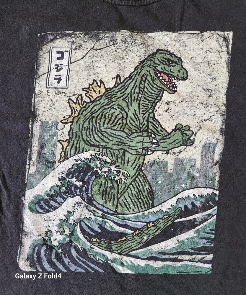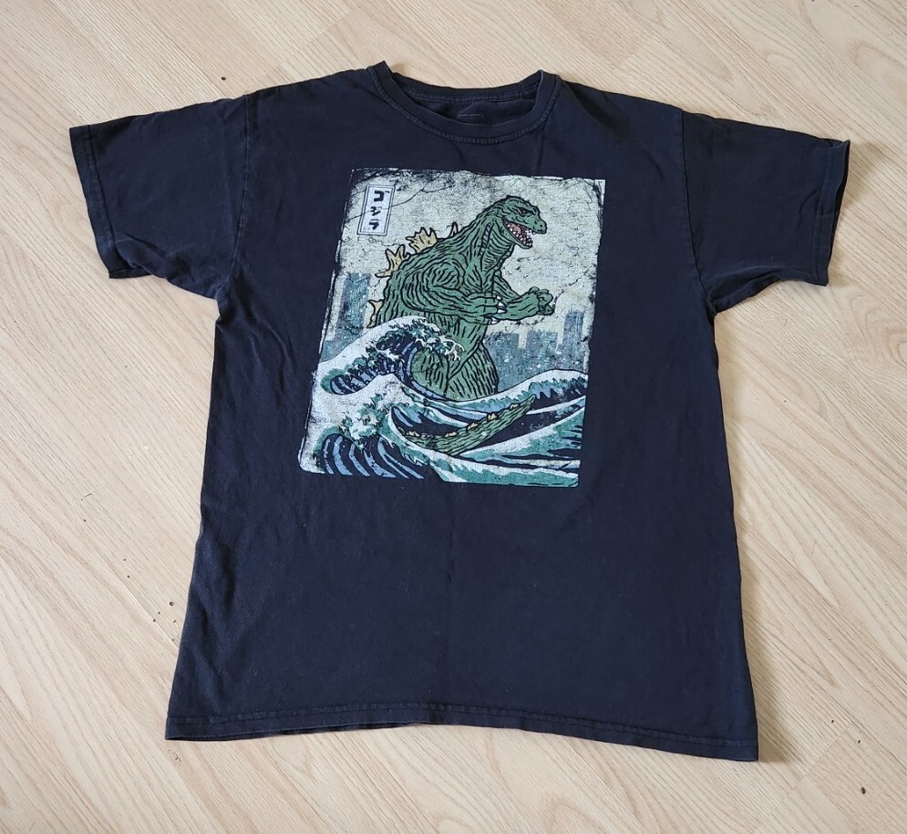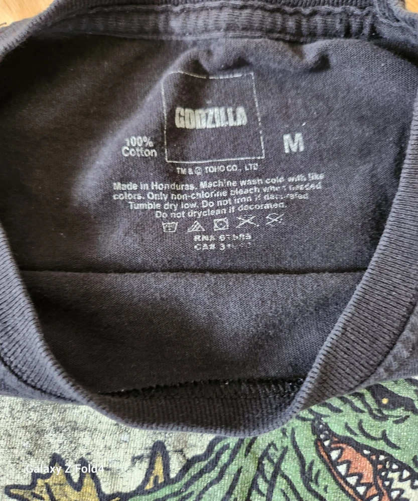 Show off your love for the classic movie monster with this black Godzilla t-shirt! Featuring the iconic logo on the front, this shirt is made from comfortable cotton material and has a regular fit. It has short sleeves and a crew neck, making it perfect for all seasons. This t-shirt is great for any fan of the Godzilla franchise, whether you're a vintage collector or just enjoy the latest movies. It's size M and was made in Honduras. Get your hands on this iconic piece of clothing now!