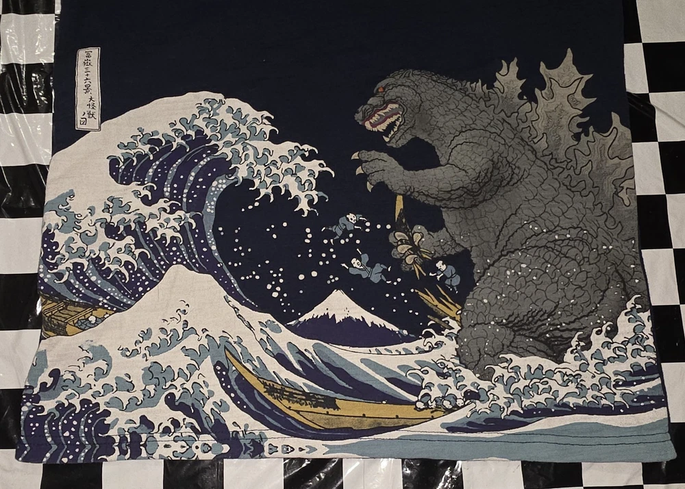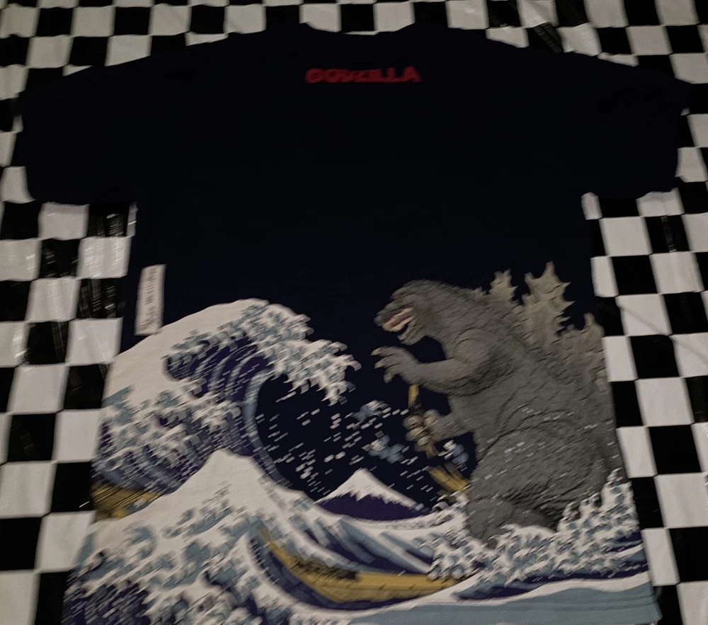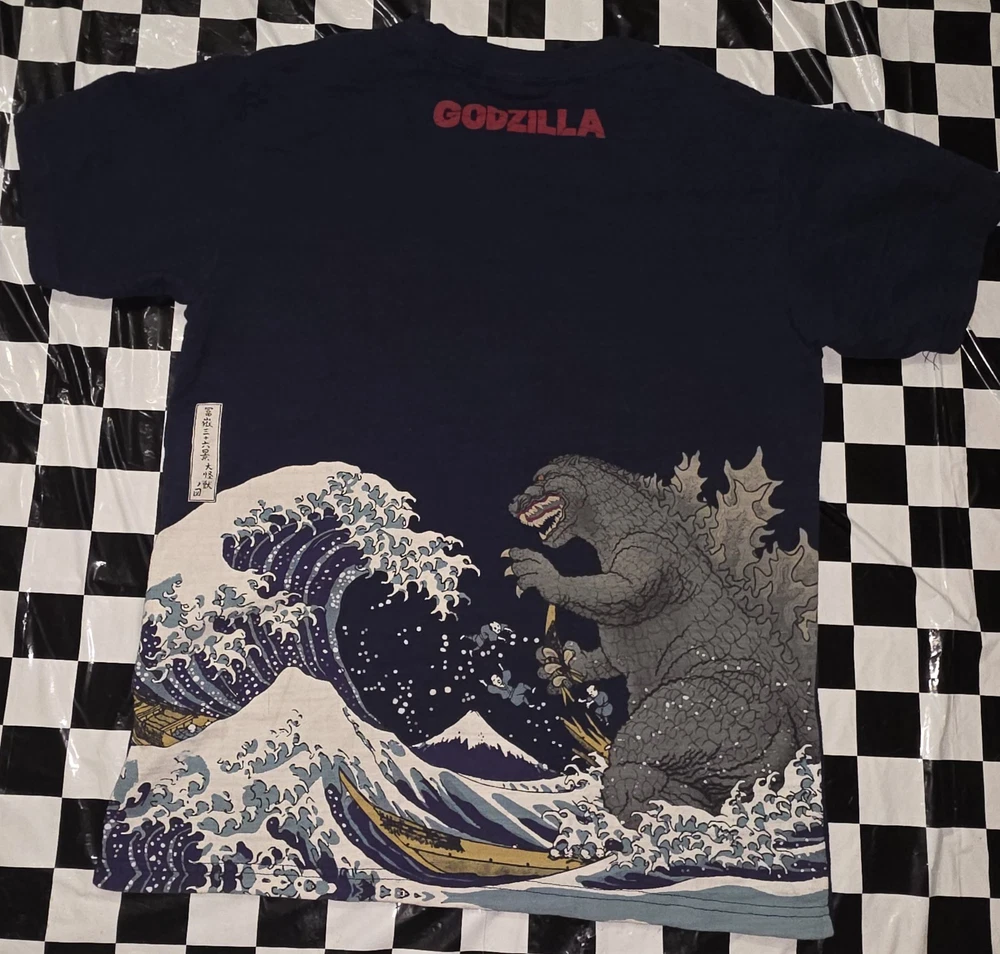 This Godzilla Navy Blue Cotton T-shirt features a striking Ukiyoe Wave print, perfect for fans of the iconic monster. Made from a comfortable cotton blend material, this regular fit crew neck t-shirt is suitable for unisex adults in size M. The graphic print showcases a pop style depiction of Godzilla, adding a touch of fun and personality to any outfit. Ideal for casual wear, this graphic tee is a must-have for any Godzilla enthusiast looking to showcase their love for the legendary monster.