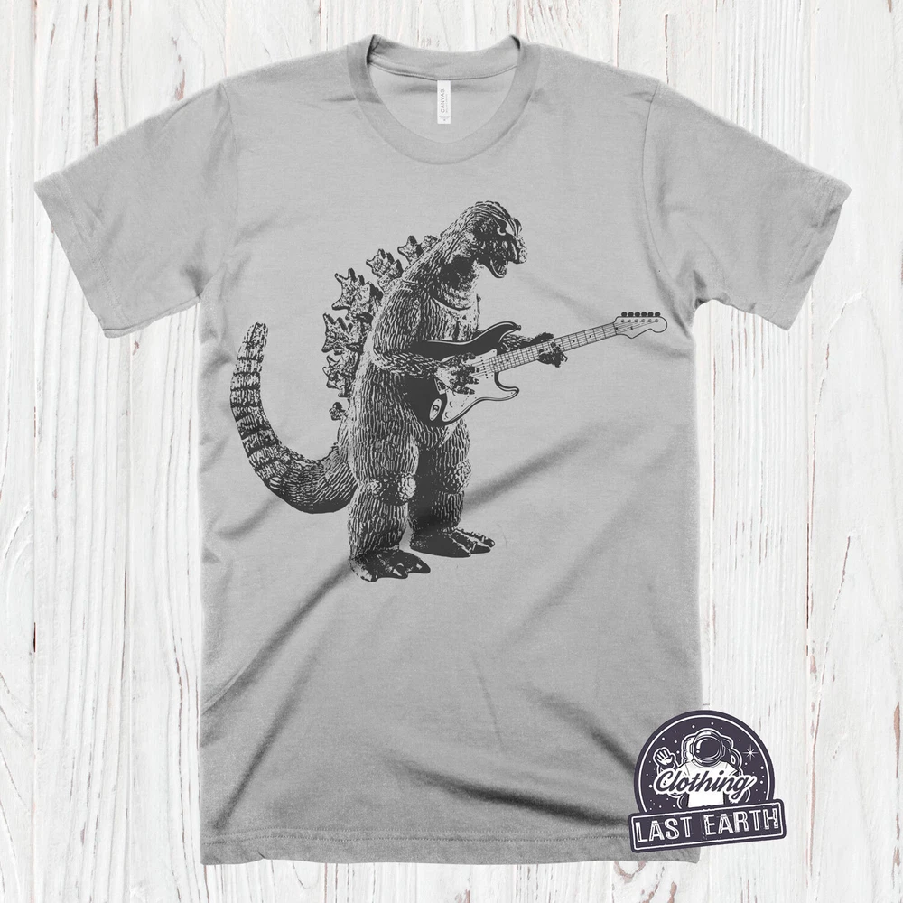 Godzilla Playing Guitar Funny T-Shirt [ QUALITY OF OUR T SHIRTS & INKS ] We use 100% ring-spun combed cotton, pre-shrunk durable t-shirts. Our heather-ed tees are a soft poly cotton blend for an even softer feel. With 2 extra inches in length and durable stitch side seams you will love the soft feel and look of a true vintage styled tee. Satisfaction Guaranteed! We use non toxic eco friendly water based inks that are cured with forced air technology. Our inks have a soft hand feel to the touch. Every Tee is professionally hand screen printed through, high mesh aluminum screens for clear vibrant images. No cheap iron transfers here. [ MEN'S SIZE MEASUREMENTS] See Chart Our Mens / Unisex run True to size. The size you normally wear should fit nicely. For Womens tee's, If you are between sizes or prefer a little more room we recommend ordering one size up. Please refer to the size chart photo above for tee specification. [ SHIPPING & HANDLING ] * Orders ship out Fast within 1-3 business days * We ship everywhere! Thank you for shopping with us. If there is anything you need help with regarding color, sizes, or wholesale info please do not hesitate to contact us. Check out our shop announcements for special offers and promotions.