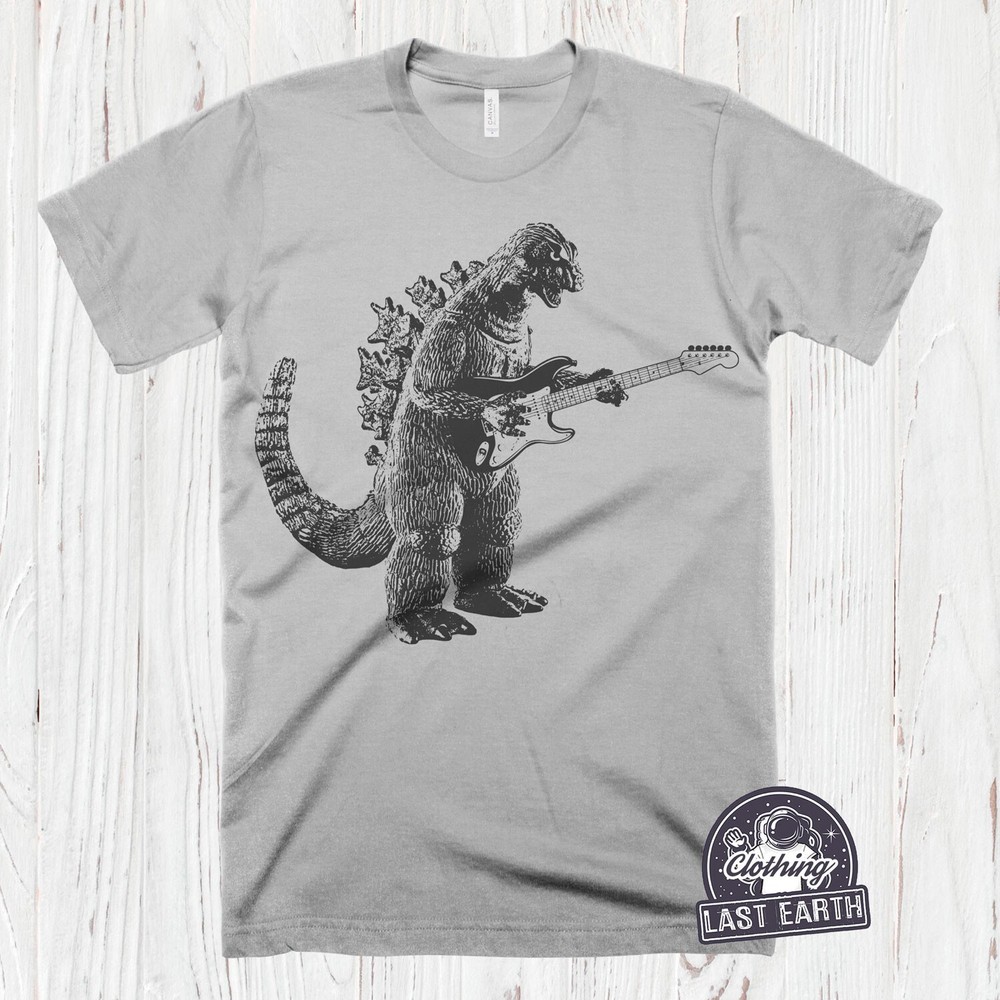 Godzilla Playing Guitar T-Shirt LAST ONE ON SALE Size: Youth M (Age 8) Color: Heather Grey Condition: New with Tag Super Soft Ring-Spun Cotton/Polyester Non Toxic Eco-Friendly Ink Relaxing & Comfortable Fit Ships Same or Next Day