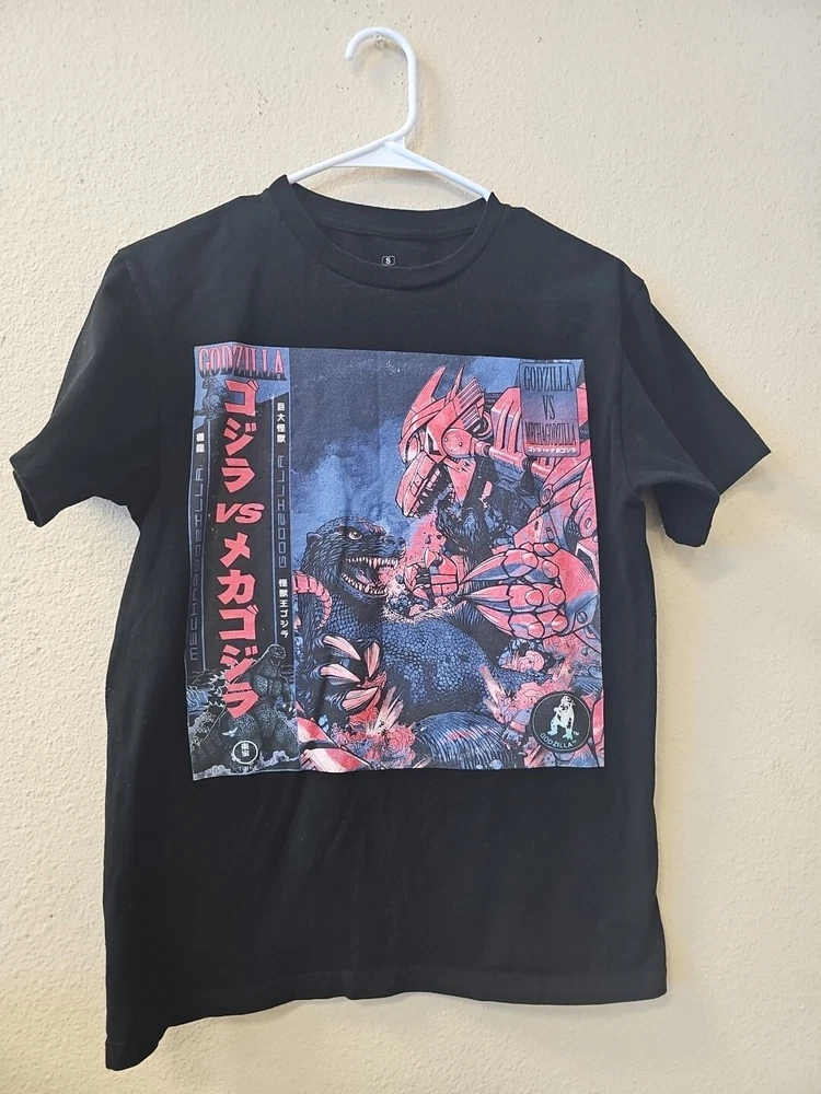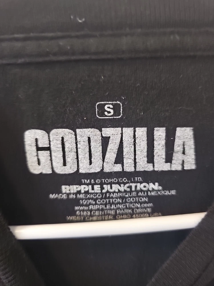 This Godzilla graphic T-shirt from Ripple Junction is a must-have for fans of the iconic movie monster. The shirt comes in a classic black color and features a bold graphic print that captures the essence of Godzilla's power and destructive potential. The shirt is available in a regular fit, perfect for both men and women who want to show off their love for the legendary creature. The T-shirt is made from high-quality materials and is sure to last for years to come. Whether you're a fan of the Godzilla movies or just love the retro look of the shirt, this is a great addition to any wardrobe. So why wait? Add this Ripple Junction Godzilla T-shirt to your collection today and show off your love for the king of the monsters! Very good condition Measurements 25" back of neck to bottom, 19.5" pit to pit
