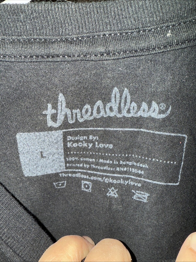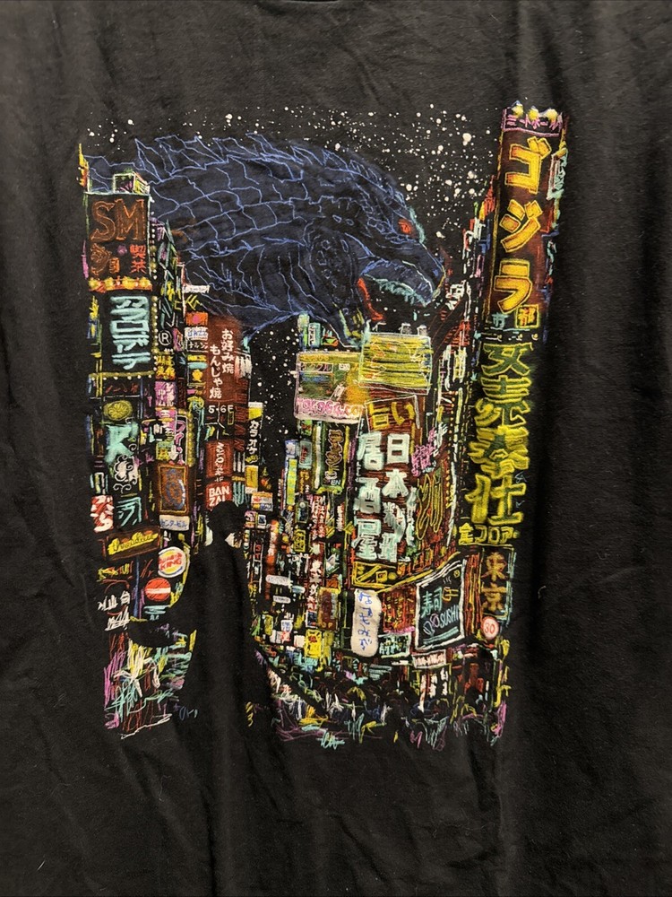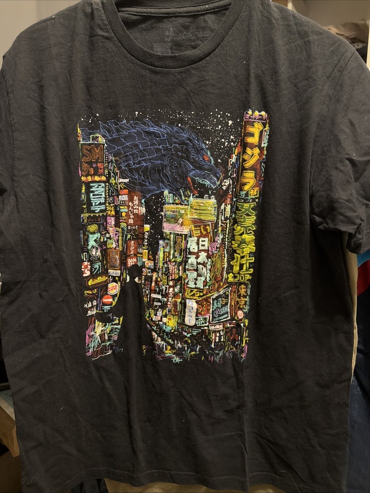 This is a Godzilla themed men's t-shirt in size Large, featuring a Kaiju City design on a black cotton material. The shirt has a crew neck and short sleeves, with a regular fit. It is branded by Gildan and includes a unique Kooky Love design with a Naruto Tree element, making it a rare find for fans of Godzilla and kaiju.