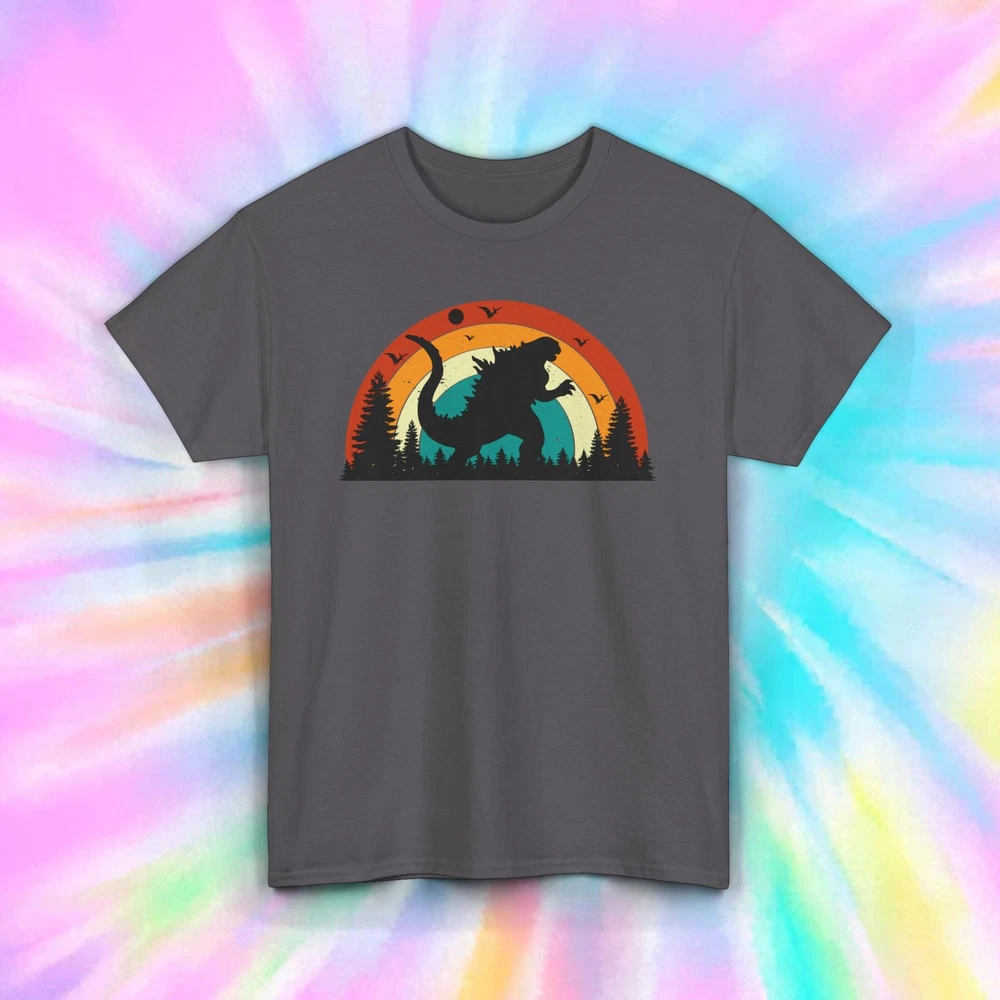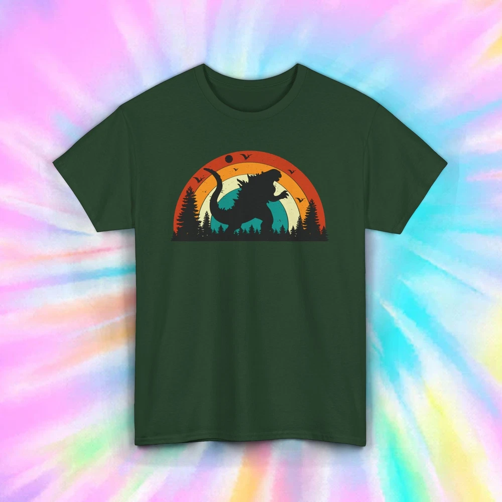 "Godzilla Silhouette Retro Sunset" Tee Description: Embrace your love for the iconic monster with this "Godzilla Silhouette Retro Sunset" tee! Featuring the towering figure of Godzilla in a dramatic silhouette against a vibrant sunset, this shirt captures the beast's epic nature in a bold and stylish design. Perfect for fans of classic monster films, retro aesthetics, and nature-inspired themes. Features: Material: Made from 100% soft, breathable cotton for all-day comfort. Fit: Unisex, available in sizes S-5XL, ensuring a great fit for everyone. Design: Black tee with a striking Godzilla silhouette set against a multi-colored vintage sunset, with trees and birds framing the scene. Versatile Wear: Ideal for movie nights, casual outings, or as part of your everyday wardrobe. Keywords: Godzilla t-shirt, retro monster apparel, sunset silhouette tee, vintage style Godzilla shirt. Perfect For: Fans of Godzilla and classic monster movies. Anyone who enjoys retro, nature-inspired fashion. Unique gift for birthdays, holidays, or special occasions. Specifications: Medium-weight fabric ensures durability while maintaining comfort. Tear-away label for easy customization. Machine washable, making it easy to care for. Shipping Details: Orders are dispatched within 1-3 business days. Free economy shipping is available, with expedited options starting at just $1. Returns Policy: Returns are accepted for buyer’s change of mind or errors, with the buyer responsible for return shipping. For defective items, provide documentation (photos or description), and we’ll offer a refund or replacement.