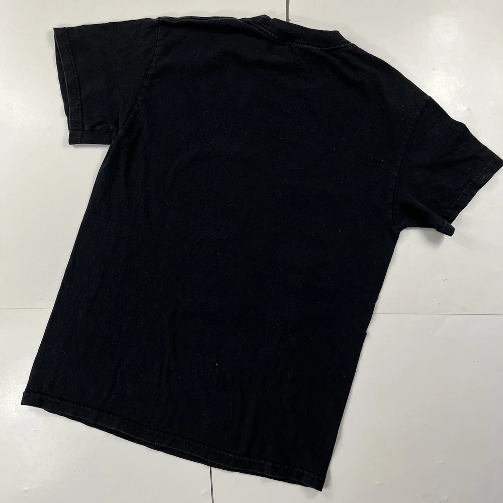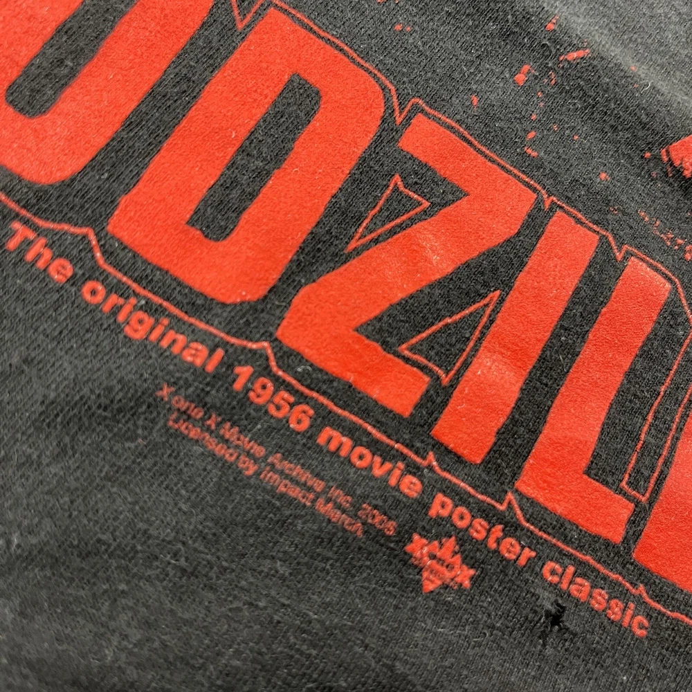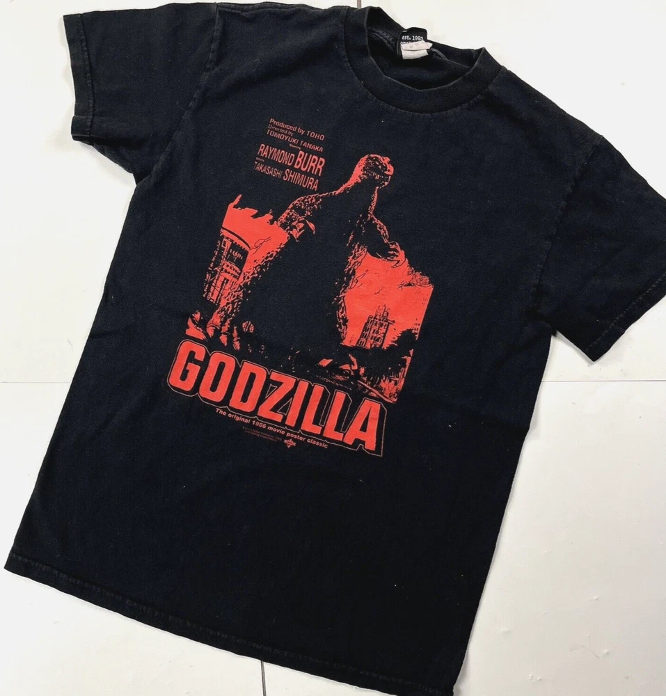 This black unisex graphic tee features the iconic Godzilla and other monsters from the 1956 Japanese sci-fi movie poster. Made from 100% cotton, it is preshrunk and heavyweight for easy care. The crew neck shirt has short sleeves and a solid pattern. It is machine washable and proudly made in Nicaragua. This Impact t-shirt comes in size small and fits regular. It is perfect for fans of nature, art, horror, cartoons, and cosplay. With its vintage theme and geeky design, it is a must-have for any Godzilla or Toho fan. Whether you're going for a retro or hipster look, this shirt is the perfect addition to your wardrobe.