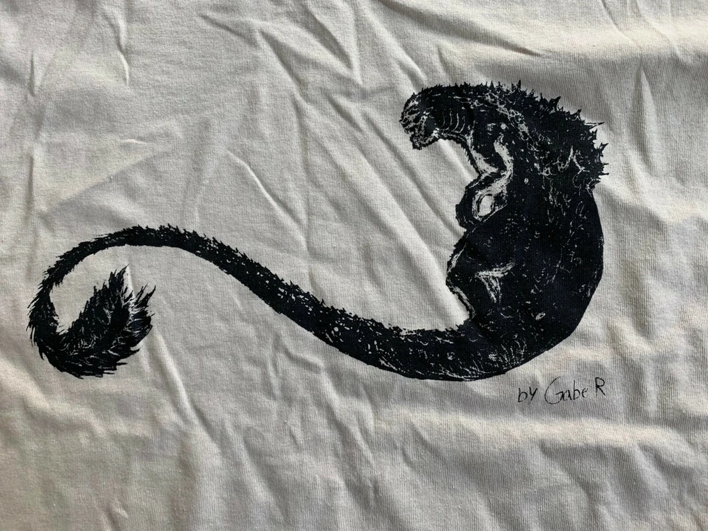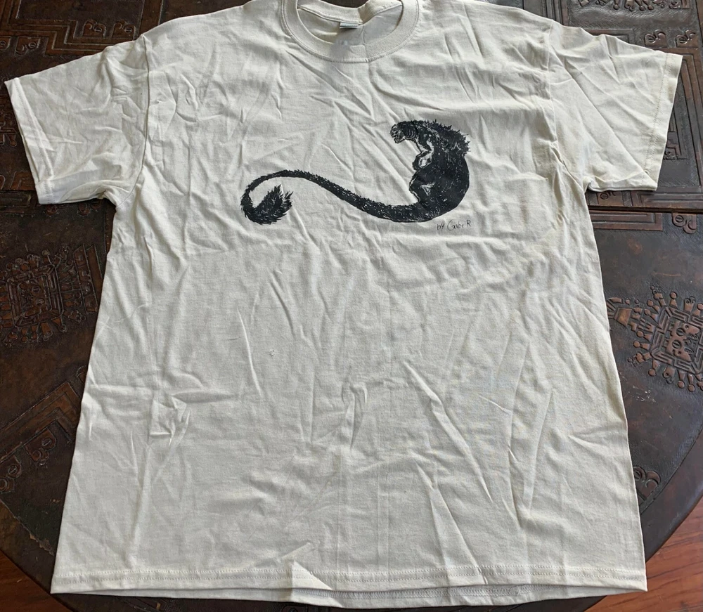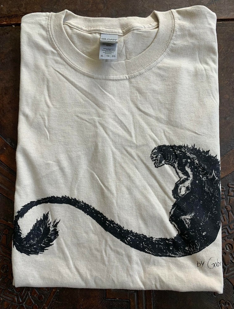 Godzilla T-Shirt, Black print On Beige, Artist Rendition By Gabriel R., Available Sizes L or XL. Available while supplies last.