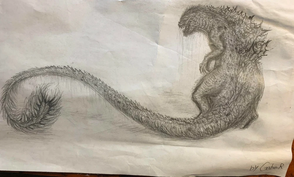 Godzilla T-Shirt, Black print On Beige, Artist Rendition By Gabriel R., Available Sizes L or XL. Available while supplies last....
