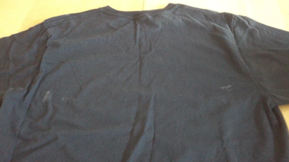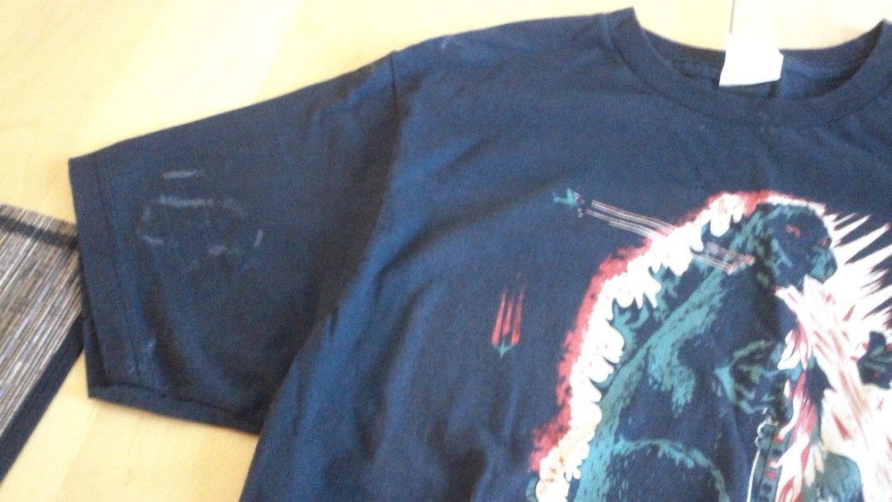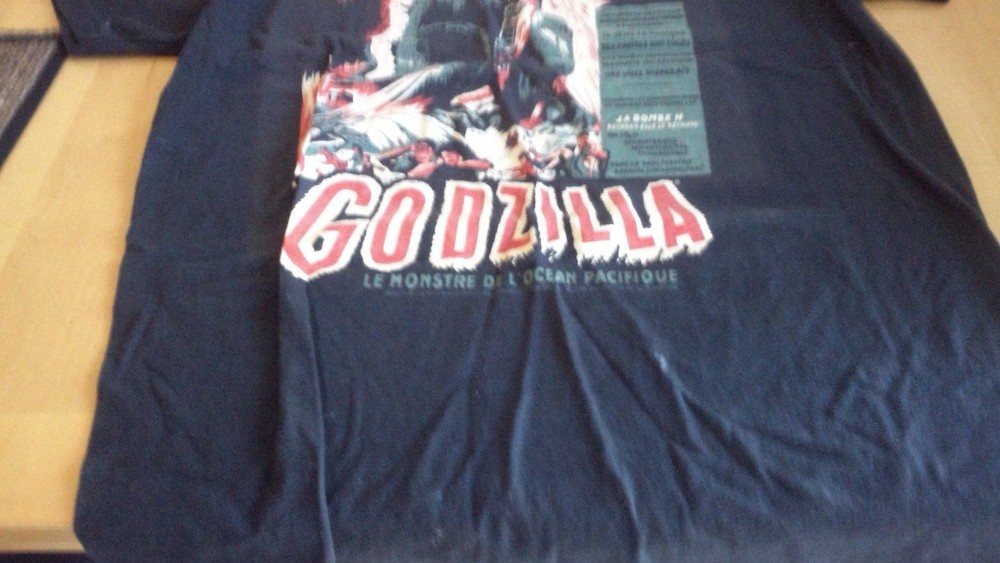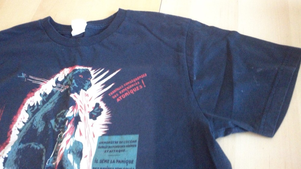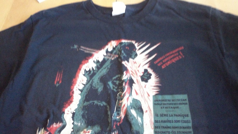 This is a used Godzilla T-Shirt that I purchased used in its current condition. The front is a French Godzilla movie poster print with nothing on the back. The t-shirt does have some stains on the front, sleeves, and back of shirt as shown in the pictures. Please let me know if you have any questions.