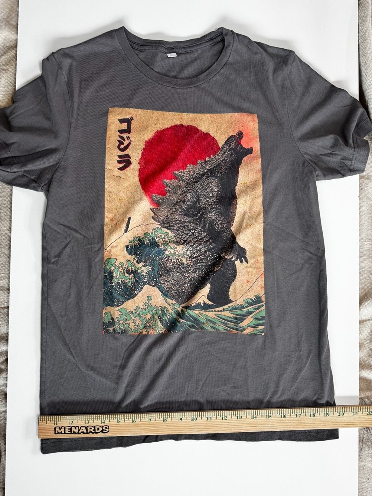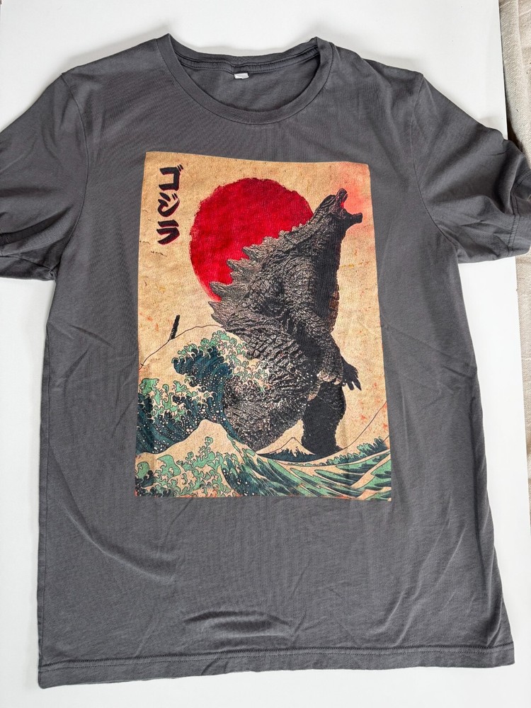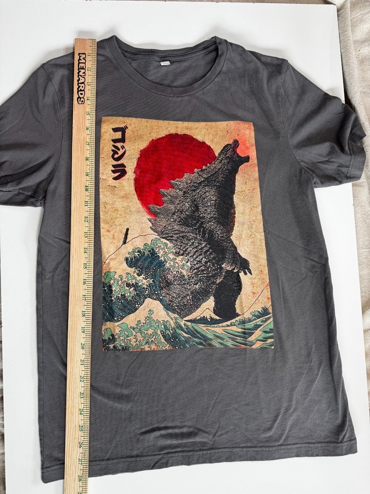 Godzilla with Great Wave Graphic on Gray T-Shirt, Size M, Pre-Owned in Excellent Condition, Cleaned and Ready to Wear!...