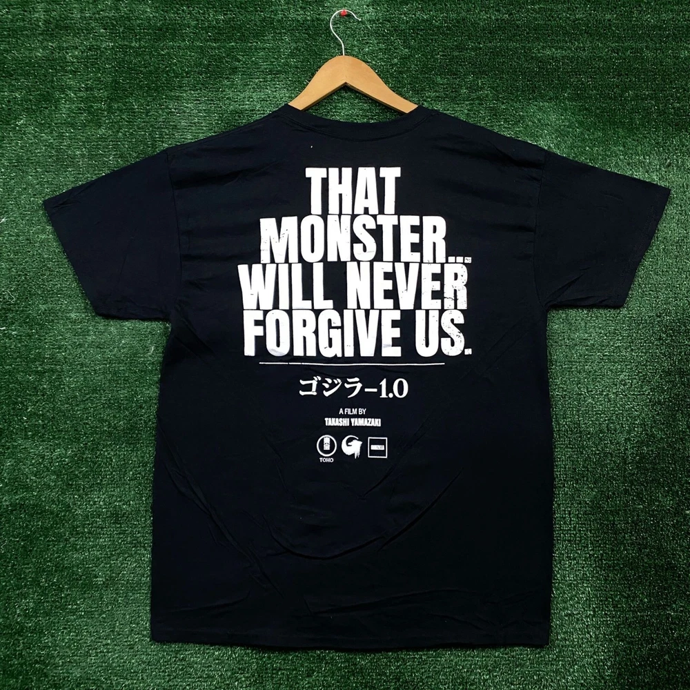 Godzilla That Monster Will Never Forgive Us Tshirt size large Its approximately 23 inches pit to pit 29 inches lengthwise. has distressing see photos. great shirt for any wardrobe...