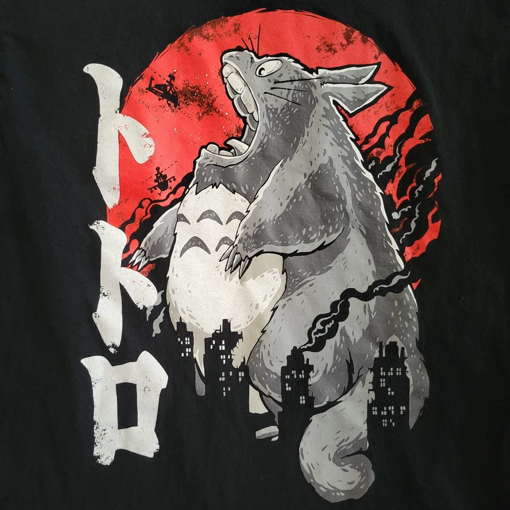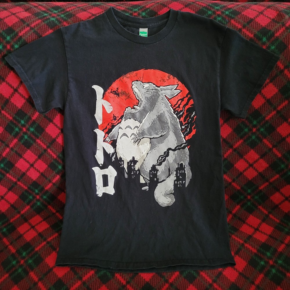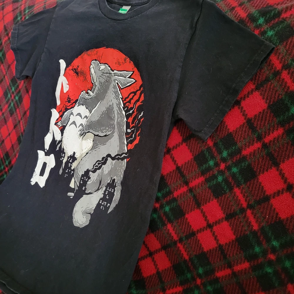 This unique T-shirt features an eye-catching mashup of two beloved characters: Godzilla and Totoro. The graphic design is set against a dark gray background and is sure to make a statement. It's made by Gildan and comes in size small, with a regular fit that's perfect for men who enjoy a classic T-shirt. The shirt is made from high-quality materials and features a comfortable fit that's suitable for everyday wear. The graphic design is inspired by the cartoon theme and is sure to appeal to fans of both Godzilla and Totoro. This T-shirt is perfect for anyone looking to add a touch of personality to their wardrobe.