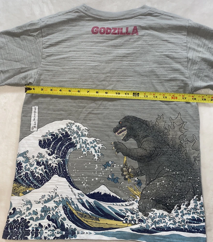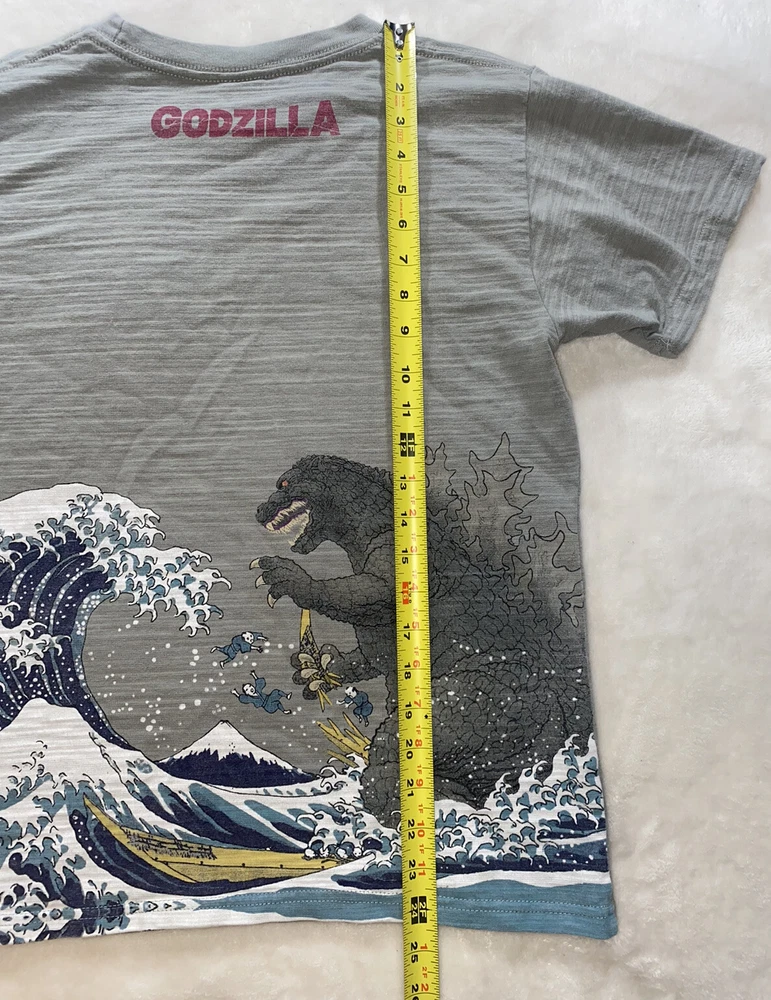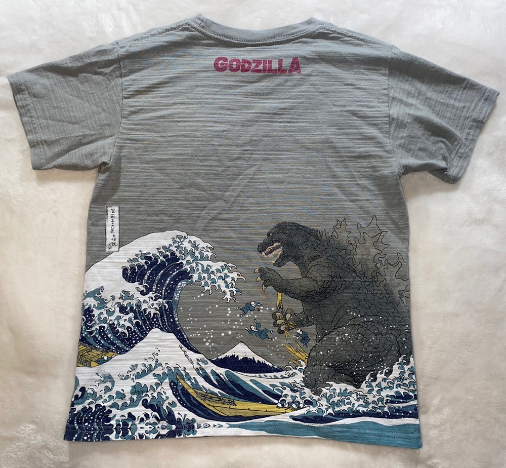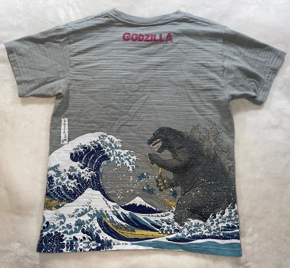 Godzilla T-shirt Ukiyoe Japanese Traditional Print Wagara Gray Size Medium. The condition is Pre-owned. 100 Percent Authentic. Please examine the pictures carefully before purchase. Flaw shown in the last picture (small hole on the collar). Feel free to message me if you have any questions.