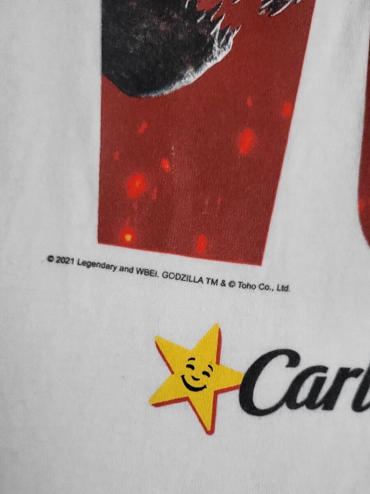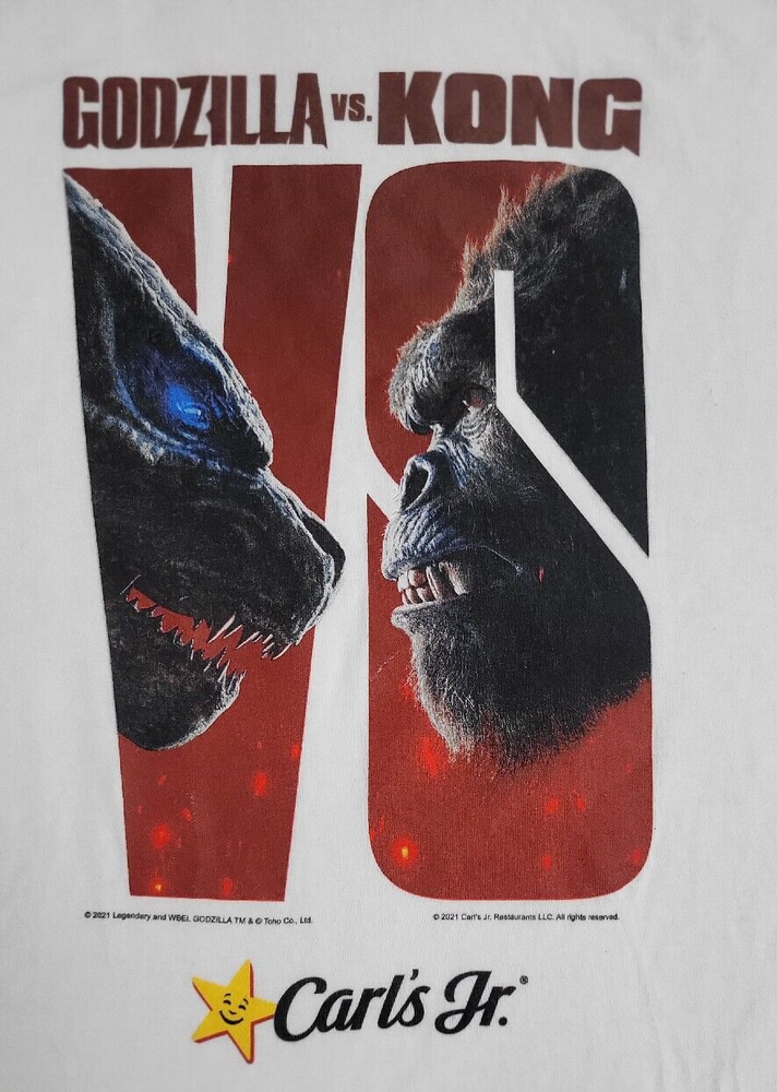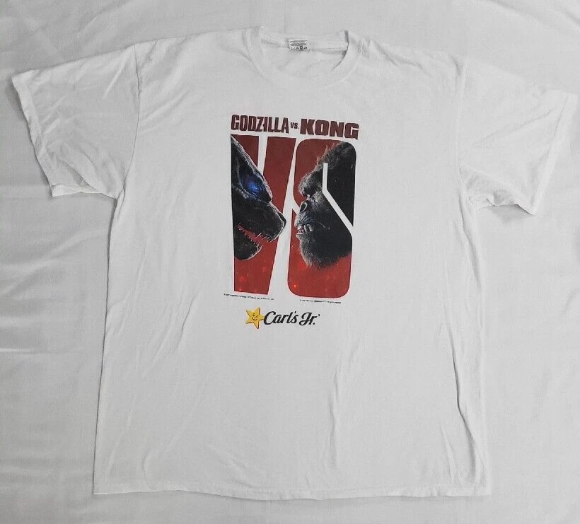 Godzilla VS Kong Movie Theme T-Shirt Carl's Jr. Promo 2021 Size- XL , Pit-to-Pit 22.5" Length (shoulder Collar to Hem) 29.5" Brand - ATC Shirt Color- White Made in -Honduras Used item, See pictures for Condition We will combine shipping, when possible. Check out our store for more Great items.