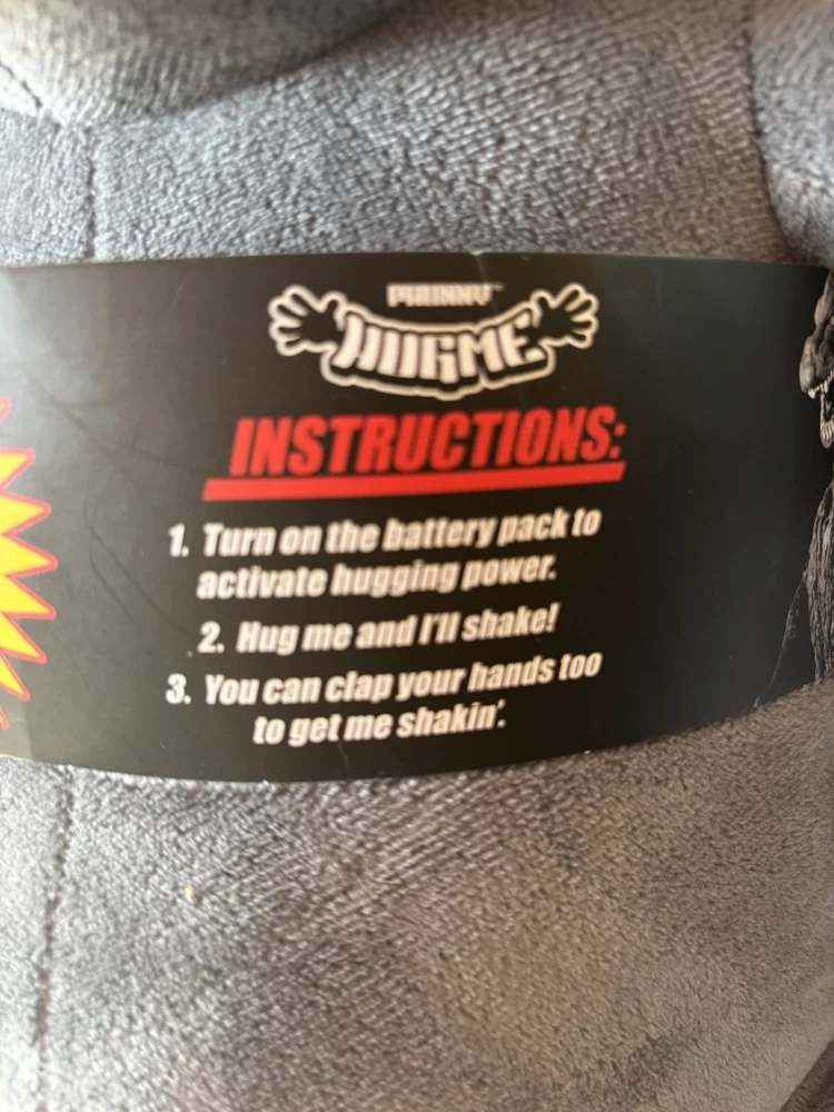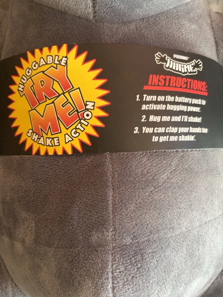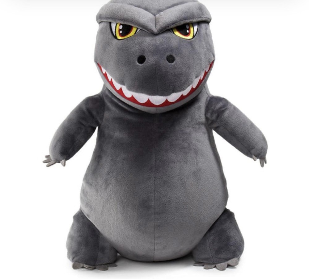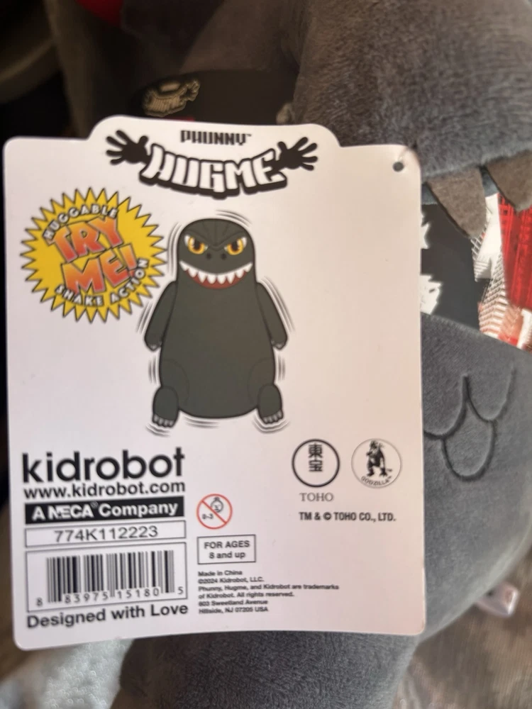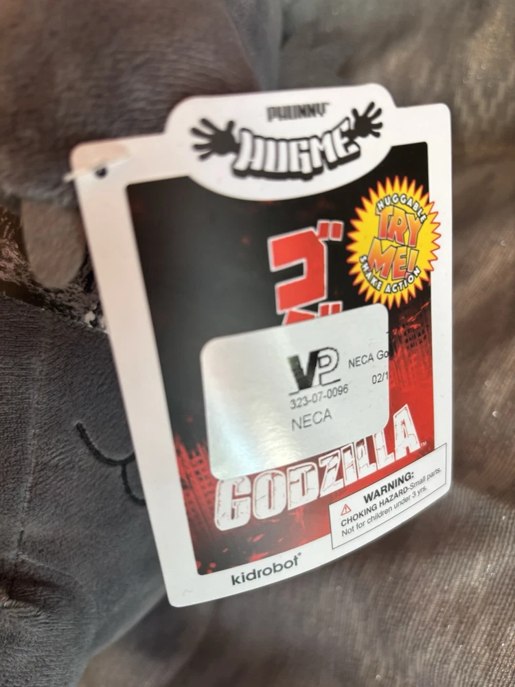 Adorable gray dinosaur plush toy with red and white details. Perfect for cuddling. Original price 59.00$ GODZILLA 16" HugMe Vibrating Plush by Kidrobot The king of the monsters and destroyer of cities, GODZILLA, is about to get super-sized and cuddly in plushie form! This Godzilla plush is going to destroy your heart with cuteness just in time for the Godzilla movie! Kidrobot has got you covered with not only our smaller Godzilla plush Phunny but we also have created an all-new line of cuddly plush creatures with shake action including this Godzilla HugMe Vibrating Plush! Each Godzilla HugMe stuffed animal plush comes super-sized, standing a whopping 16 inches tall and is made from super soft high-quality plush. Additionally, each HugMe plush comes with Kidrobot's signature vibrating unit with removable batteries for a shakeably soft hug when you need one. Get yours today before he disappears back into the depths of the ocean!* Shake action when you hug it! Shake action when you clap! *3 AA batteries come included