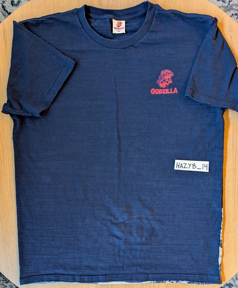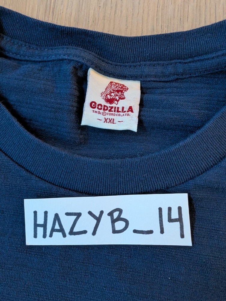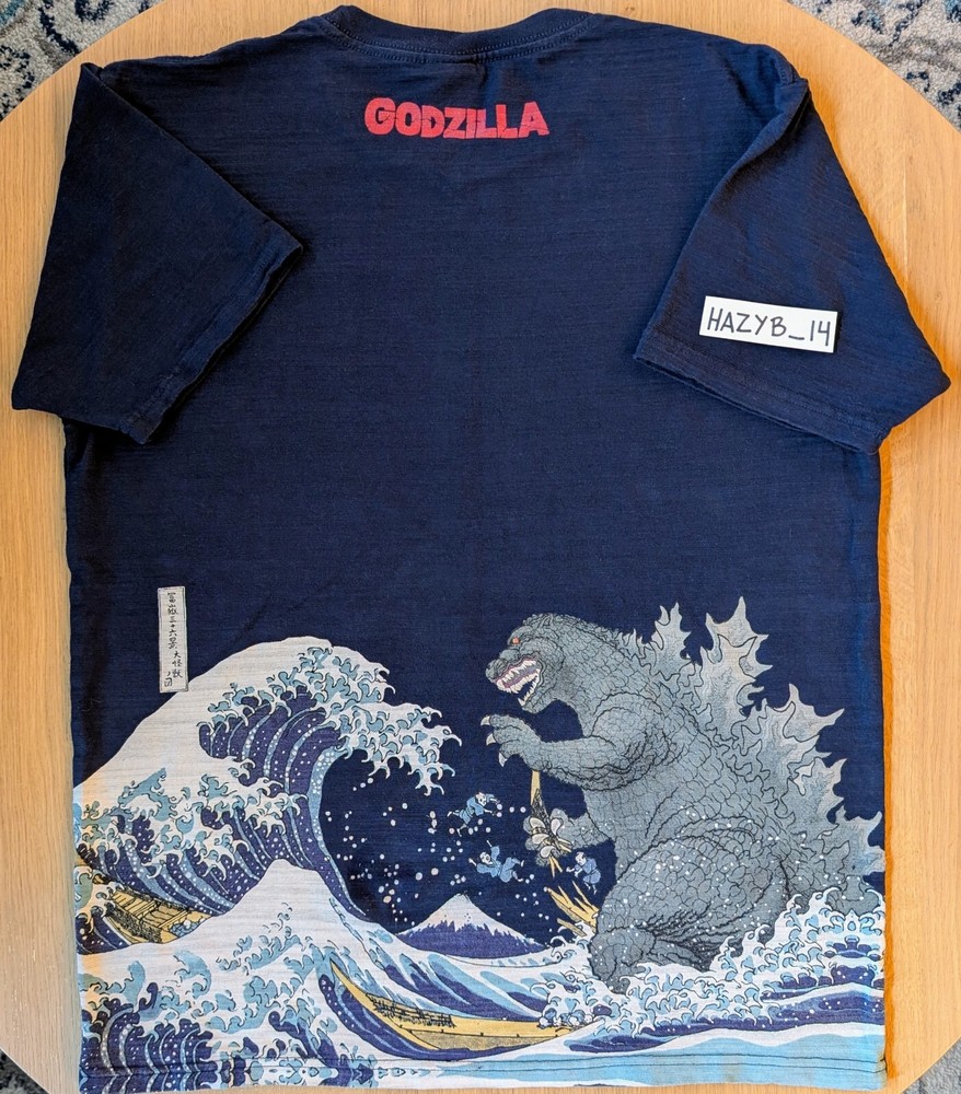 Godzilla X Hokusai Great Wave of Kanagawa double sided graphic t-shirt in size XXL. Made of cotton, it has a crew neck and short sleeves, suitable for all seasons. The shirt is machine washable and is branded by Toho, perfect for fans of Japanese art, movies, anime, and retro themes.