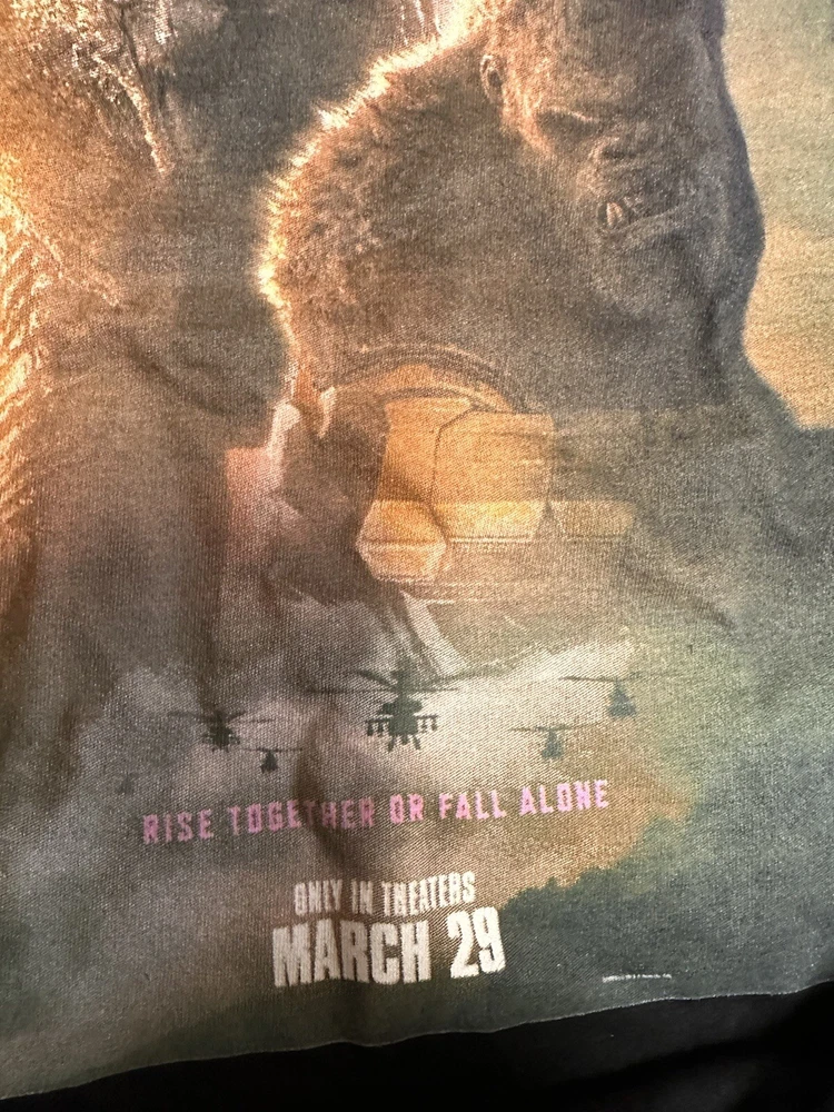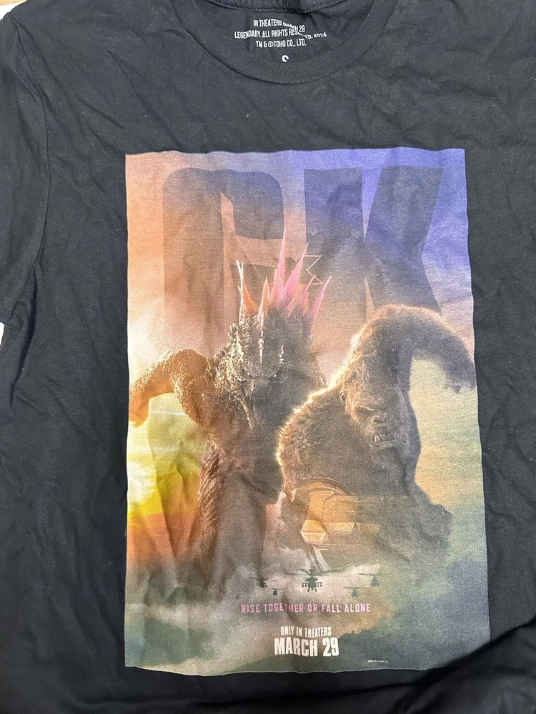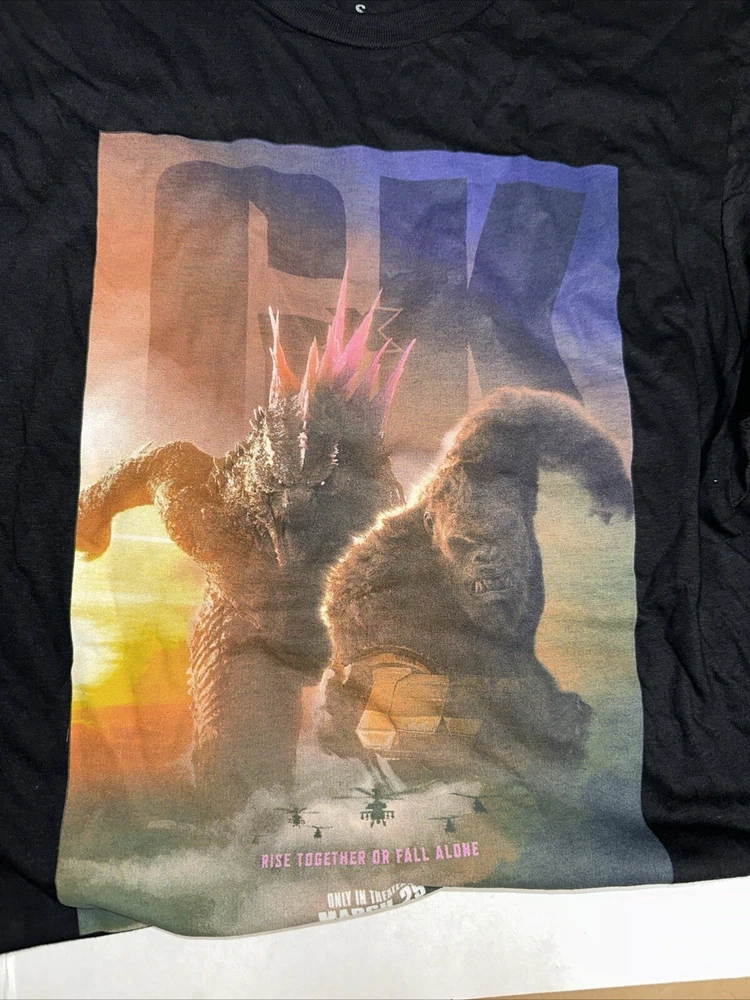 Show off your love for the epic battle between Godzilla and King Kong with this new promotional t-shirt from The New Empire! Made for men in a comfortable s size, this short-sleeved black shirt features both legendary characters in a vivid design. Perfect for fans of the movie theme, this t-shirt is a must-have addition to your collection. Made with high-quality materials, this Godzilla X King Kong t-shirt is sure to last you for years to come. Wear it to movie premieres or just out and about, and show off your passion for these iconic characters. Don't miss your chance to own this amazing t-shirt today!