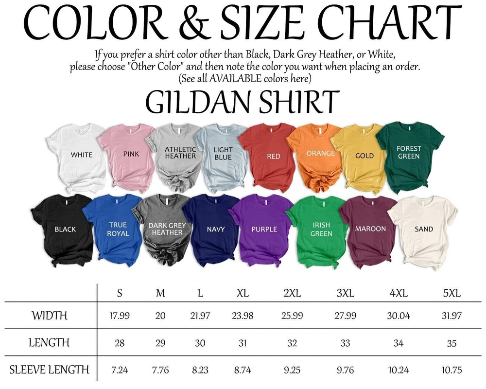 WELCOME TO OUR STORE If you are looking for a shirt for yourself or a gift for a loved one, our store is the perfect place to help you do it. We have a wide variety of t-shirt designs for you to choose from. We have attached the size chart so you can choose the right size. DESCRIPTION: Decoration type: Digital Print Material: 100% Cotton Available sizes: S, M, L, XL, 2XL, 3XL, 4XL, 5XL SHIPPING: We will process your order as soon as you place it. The time you receive the product ranges from 5 - 8 days (or maybe faster). We proudly as American based company ship to the lower 48 states. We Do Not Ship to PO/APO Boxes SERVICE: Due to lighting effect and computer color, the actual color may be slightly different from the picture. Hope for your understanding on this. But customers who have used our products are very satisfied with the products they receive from us. We do not accept returns of goods for the following reasons: Customers choose the wrong size. we only accept return for damage or bad printing result FEEDBACK: The satisfaction of our customers is the first place for us. If you are happy with your purchase, PLEASE take a moment to leave Positive feedback for us. We really appreciate that. If you are not happy with the purchase, PLEASE contact us to resolve the problem. We are always here to give you the best solutions. THANK YOU SO MUCH, HAVE A GOOD DAY!