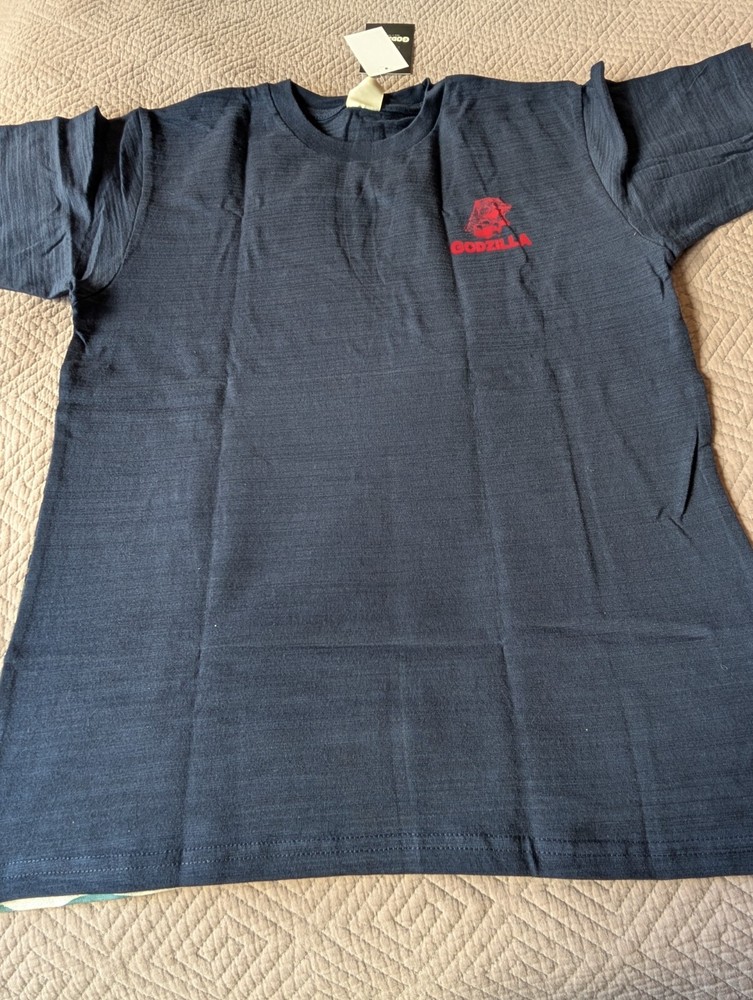 Godzilla! graphic t-shirt, Regular fit, short-sleeved tee in a vibrant blue shade. The shirt's design features a bold graphic appearing on the rear of the shirt. Front view is solid, with Japanese brand Godzilla logo.