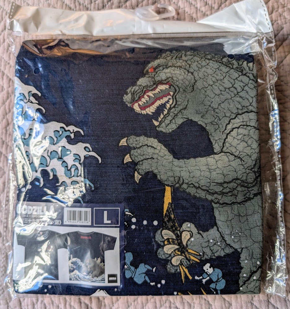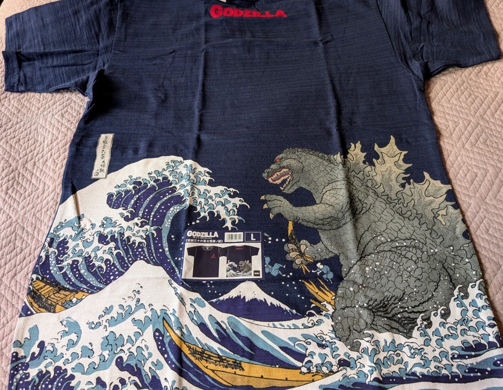 Godzilla! graphic t-shirt, Regular fit, short-sleeved tee in a vibrant blue shade. The shirt's design features a bold graphic appearing on the rear of the shirt. Front view is solid, with Japanese bra...