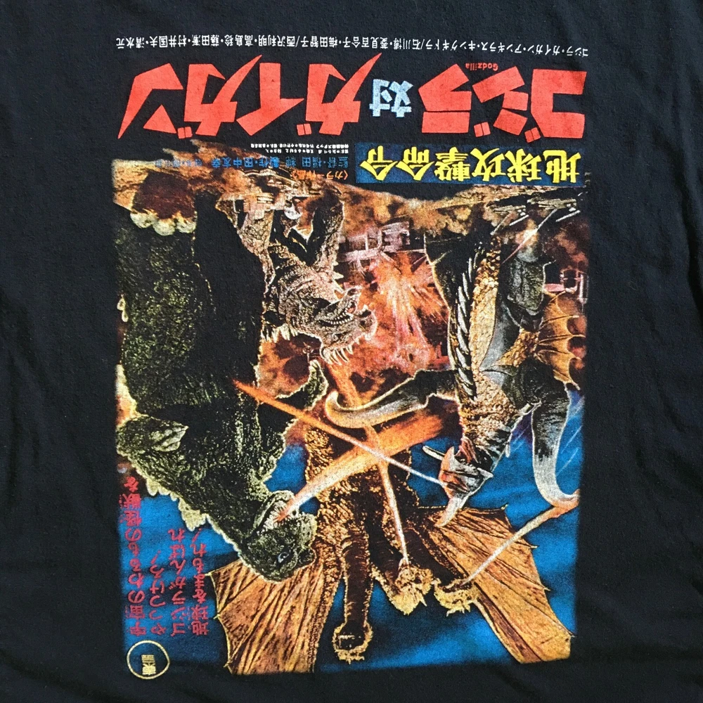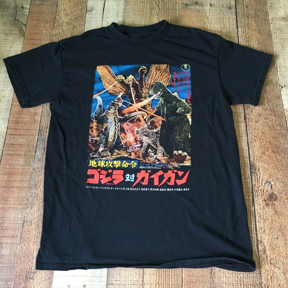 Godzilla vs Gigan T-Shirt - Japanese Movie Poster design. Note: NO TAG - Size unknown but most likely to fit like a Men's Medium (See measurements) Color: Black Width (Armpit to Armpit): 19" Length (Collar Seam to Hem): 26" Please be aware that pre-owned items may show a few signs of wear or slight fading due to age. We try our best to inspect every item and list any visible flaws, such as stains, rips, or holes in the item description. Shipping via USPS Ground Advantage . Most items ship out within 1-2 days of purchase.