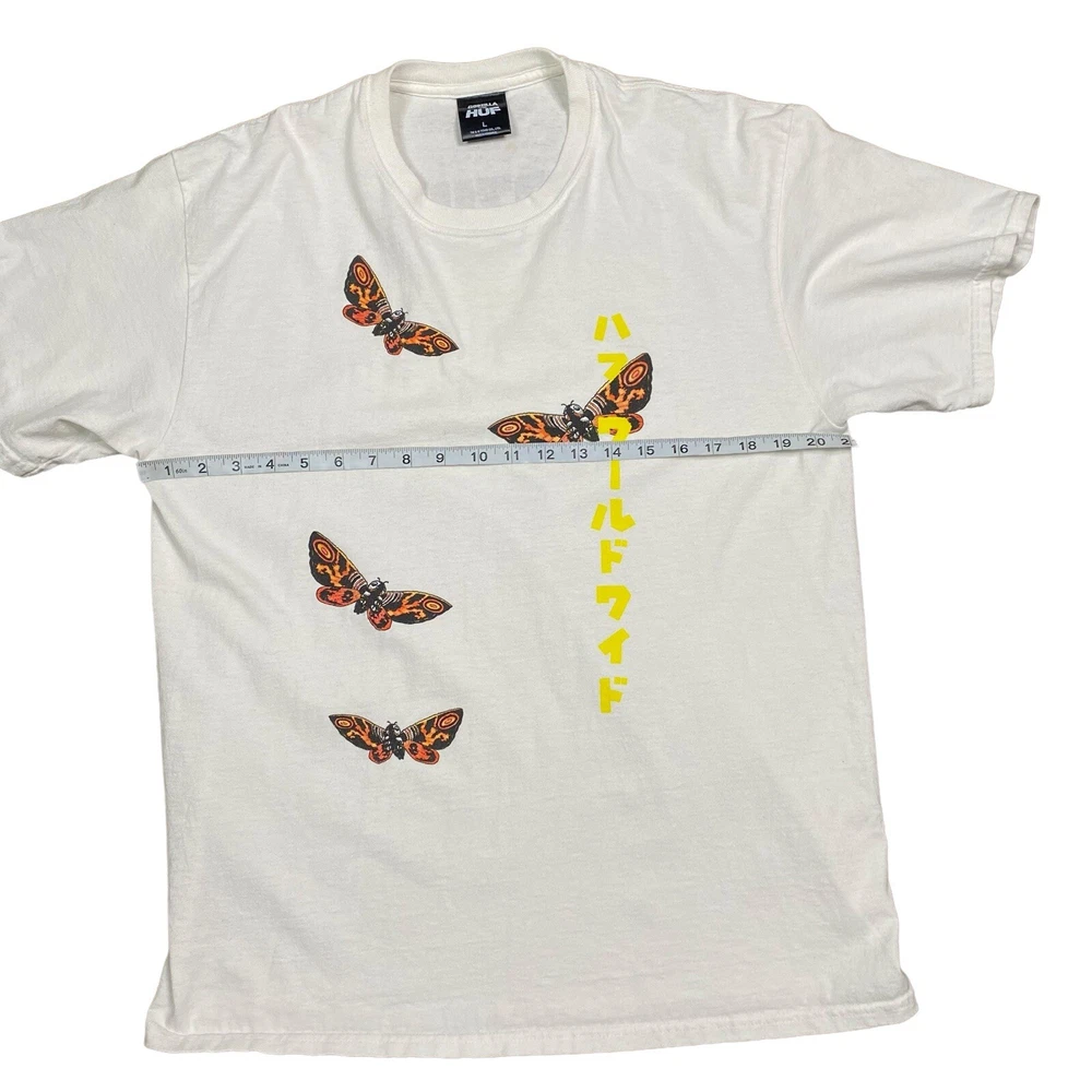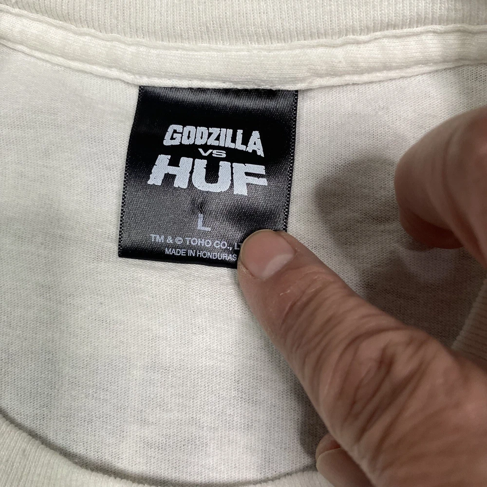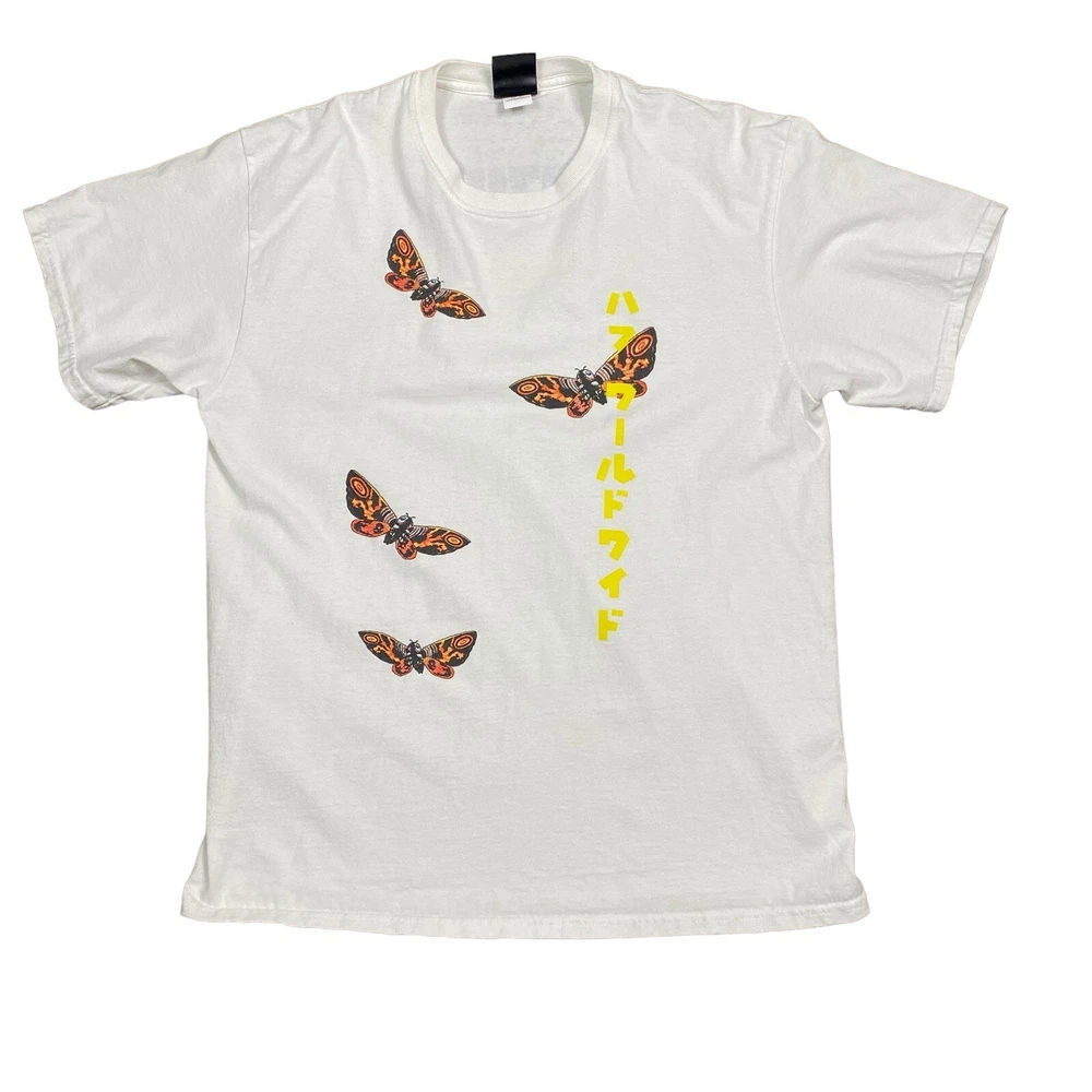 Brand: Godzilla vs. Huff Type of Shirt: Rare Print Tee Shirt Details (Print/Design): Japanese Print and Mothra Graphic on Front with Godzilla spell-out on back. Flat Measurements: Chest (armpit to armpit) = 21" Length (Collar to Hem) = 29" Fabric Type: 100% Cotton Condition: Very Good Plus