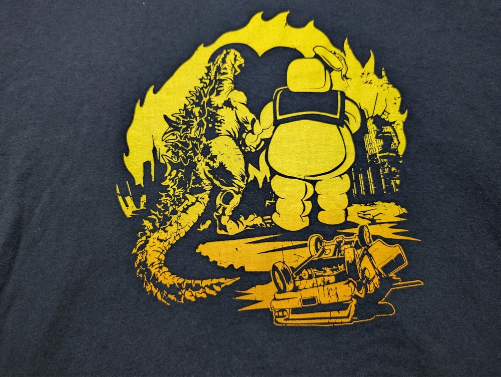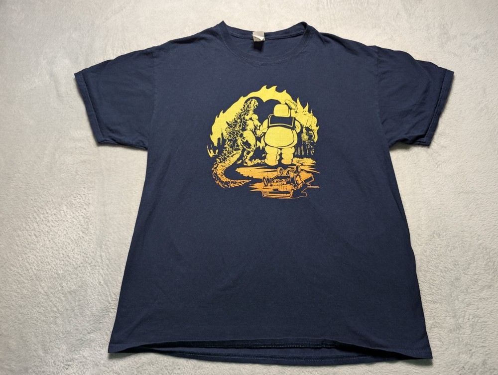 This wild and humorous t-shirt features an epic mashup of Godzilla and the Stay Puft Marshmallow Man, casually holding hands while watching a city burn! A quirky design sure to catch attention, this navy blue shirt by Fruit of the Loom is perfect for fans of pop culture mashups or just for adding some fun to your wardrobe. Key Features: ⦁ Brand: Fruit of the Loom ⦁ Model: HD Cotton Graphic T-Shirt ⦁ Design: Godzilla & Stay Puft Mashup Graphic ⦁ Functionality: Short sleeve, 100% cotton ⦁ Condition: Pre-owned, excellent condition Additional Details: ⦁ Size: Large ⦁ High-quality print with vibrant yellow tones ⦁ Fun and quirky design Shipping: ⦁ Ships within 1 business day ⦁ Safe and securely packaged ⦁ Returns accepted within 30 days Add some humor and epicness to your collection with this wild mashup tee! Feel free to contact me with any questions or for more details!