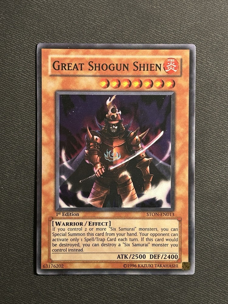 Great Shogun Shien is a Super Rare Yu-Gi-Oh! TCG card from the Strike of Neos set. It is a Warrior monster with 2500 Attack and 2400 Defense. This 1st Edition card features an Effect and belongs to the Fire attribute. The card number is STON-EN013 and it is in English language. It is manufactured by Konami.