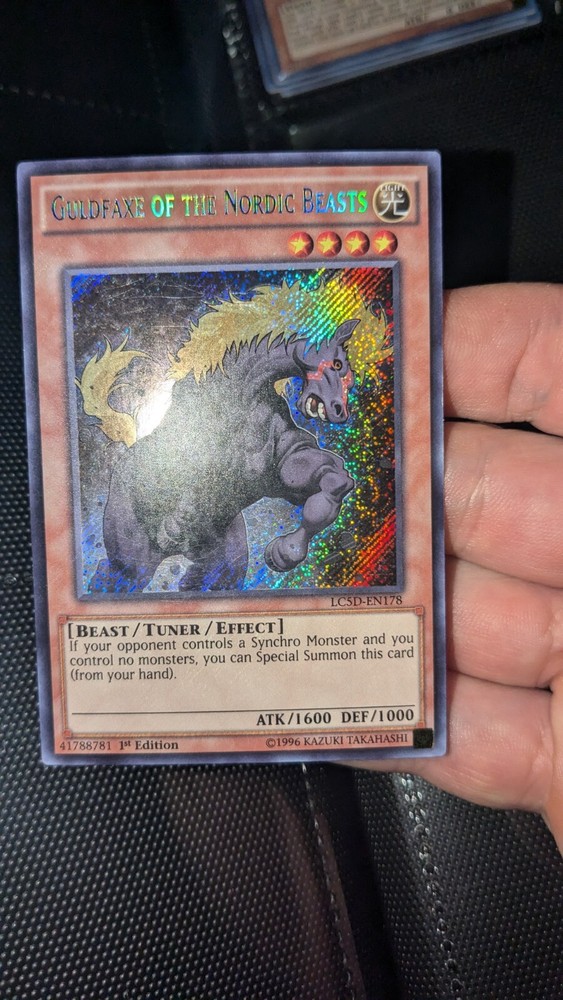 Unleash the power of the Nordic Beasts with the Guldfaxe of the Legendary Collection 5D's. This Secret Rare Tuner card, LC5D-EN178, is a must-have for any serious Yu-Gi-Oh! TCG collector or player. With an attack power of 1600 and a defense toughness of 1000, Guldfaxe is ready to take on any challenge in your deck. Boasting its 1st Edition status, this English-language card is produced by the renowned Konami and features the distinctive Light attribute, perfect for balancing out your creature/monster type lineup. Add this captivating card to your collection and experience the strategy depths it brings to your game.
