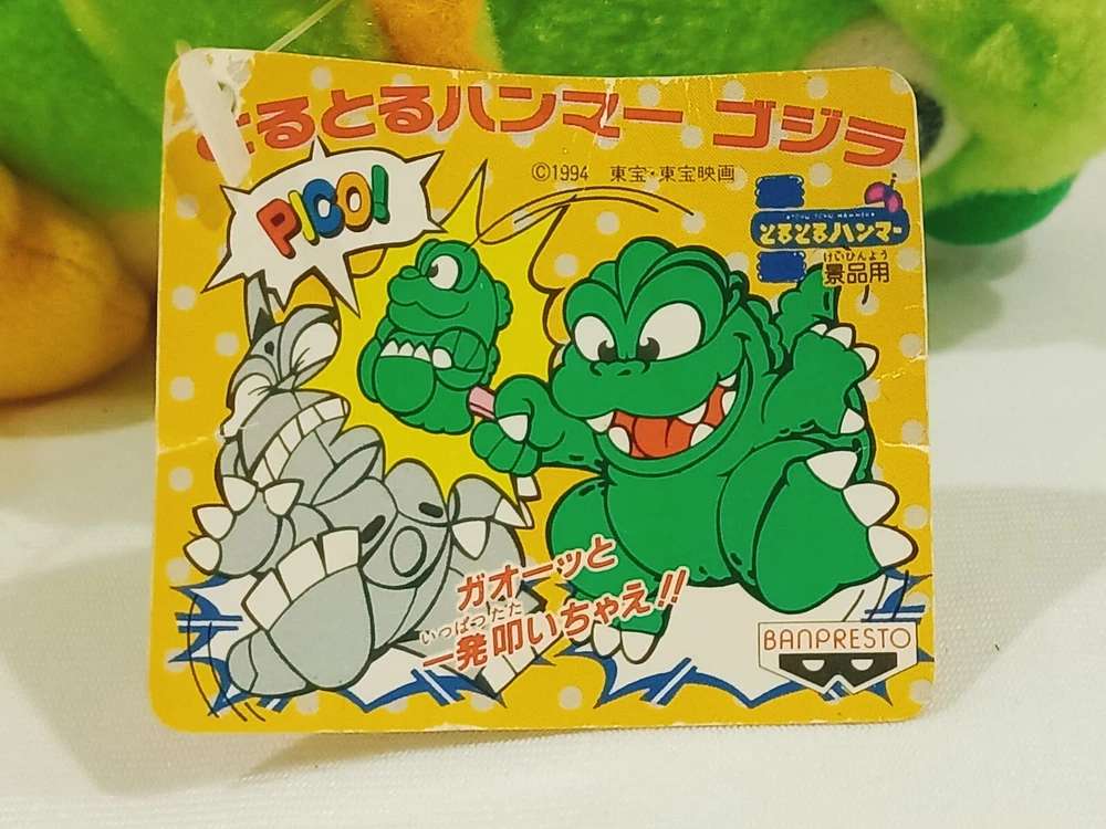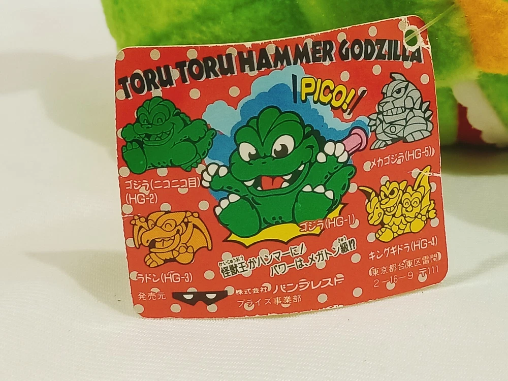 RARE Vintage Pico Pico Hammer GODZILLA 5" Tall x 7" Long Plush Doll BANPRESTO 1994. Japan Only UFO Prize. Quirky GODZILLA Collectible. HG-2 Lime Green Version With HANG TAG. ORIGINAL PHOTO OF AUTHENTIC ITEM THAT IS LISTED. WHAT YOU SEE IS WHAT YOU GET. NO FAKE PHOTOS OR BOOTLEG COPIES. FEEL FREE TO CONTACT ME FOR ANY QUESTIONS. Payment is due immediately upon commitment, thank you. PLEASE NOTE; Items will be posted to your address provided on eBay, within 1 day of purchase with tracking number (by registered post). Shipping is by Economy Standard International Thailand Post. Item must be signed off for collection. Arrival time to USA is approximately 12-23 days, Australia 4 weeks and 12-23 days for European countries. Arrival time, however, is dependent on the courier, international flight transfers, your country's customs office, and your location in the country (quicker to city areas). THANK YOU